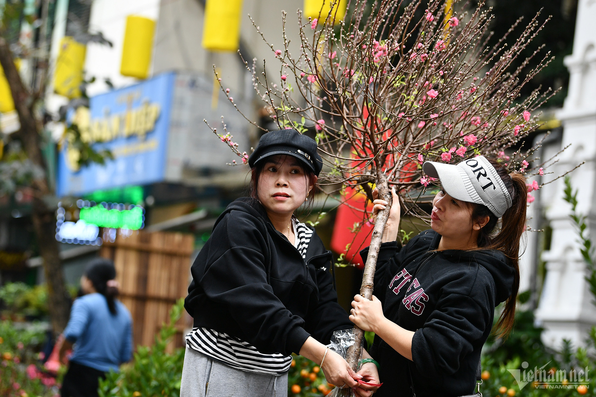桃を買って帰るために市場に行くお客さんも多いです。調査によると、今年の桃と金柑の価格は昨年と同様だという。ただし、多くの販売者はより高い価格を請求することがよくあります。顧客が交渉の仕方を知っていれば、各支店は種類に応じて 100,000 ドンから 500,000 ドンまで減額されます。