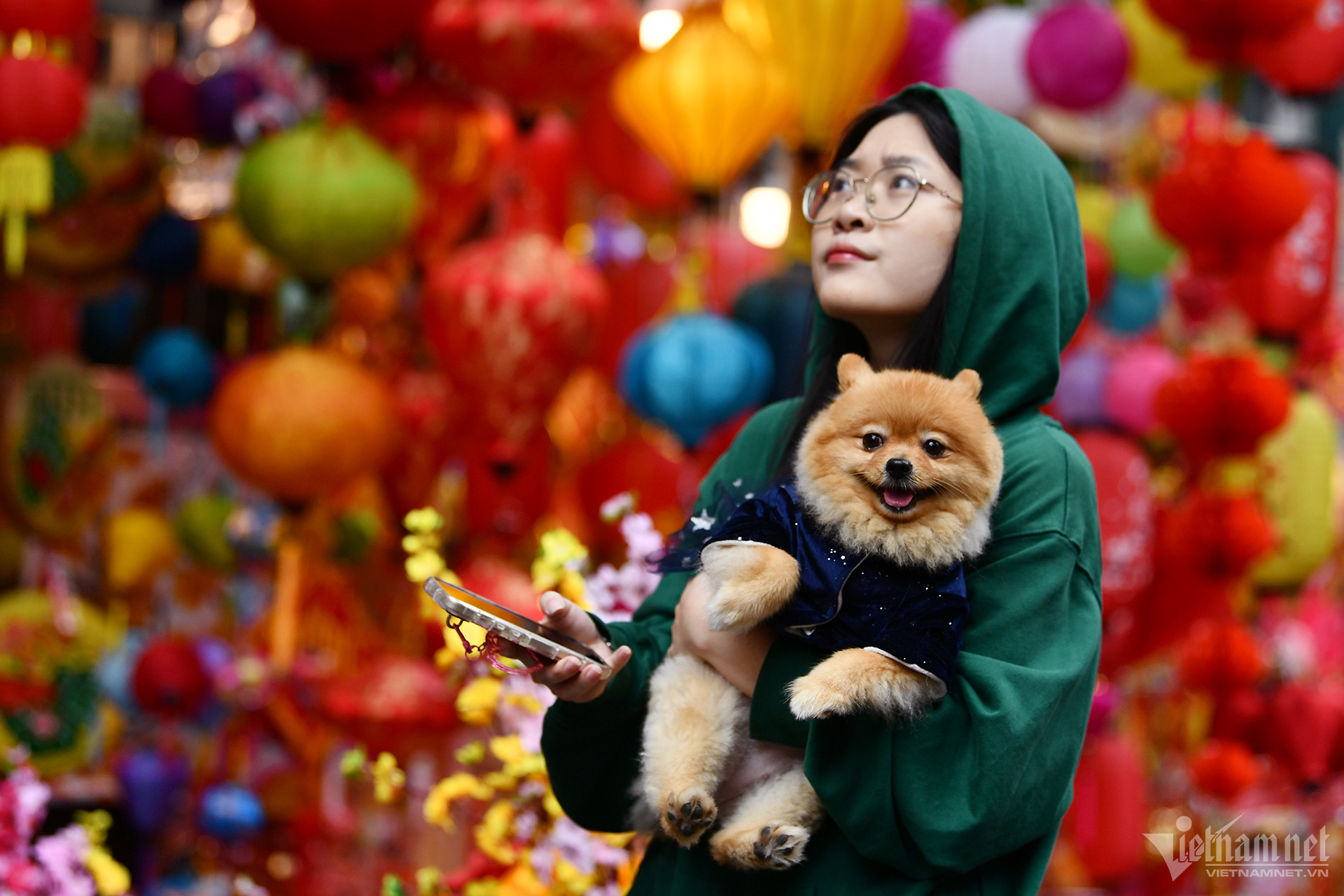 最近のハンルオック花市場は真っ赤になり、テトを象徴する装飾品が歩道に展示・吊り下げて販売されています。