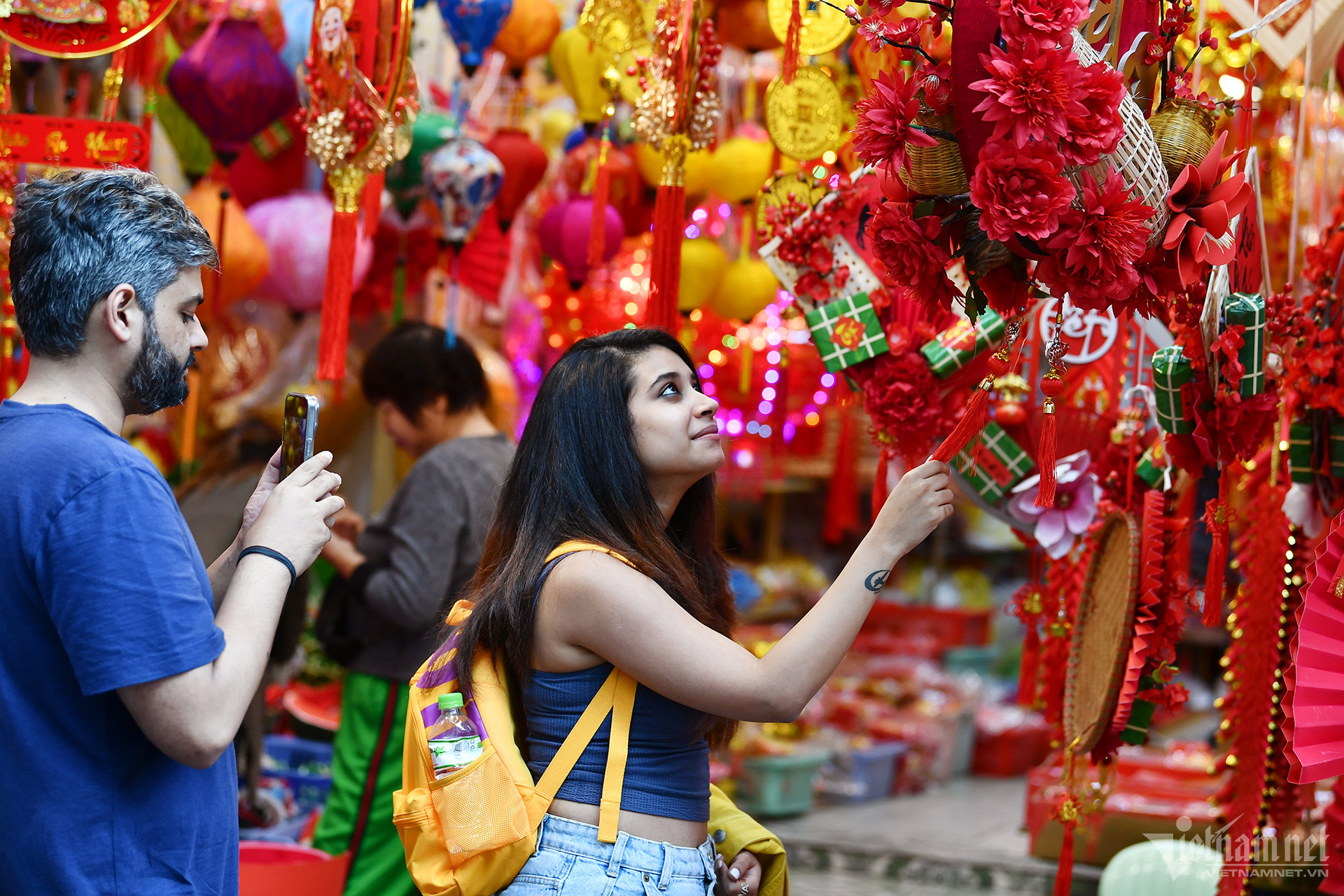 2人の外国人観光客がベトナムのテト装飾モデルと一緒に写真を撮っている。
