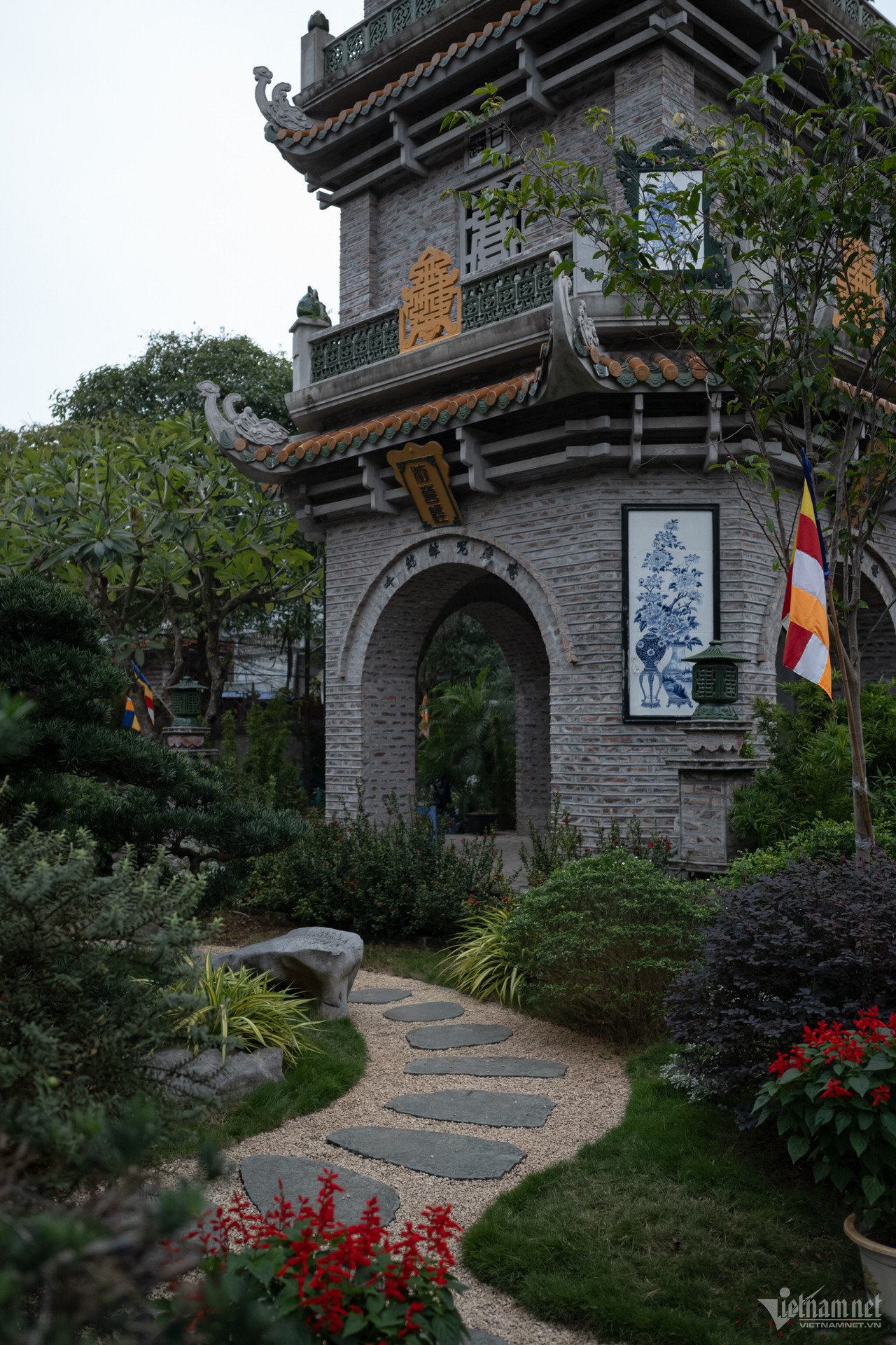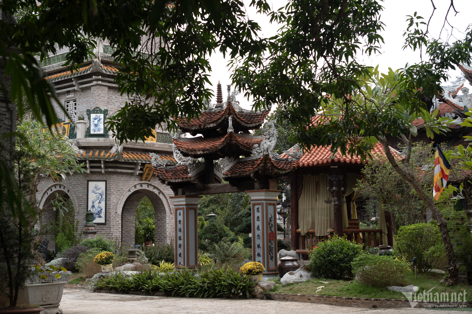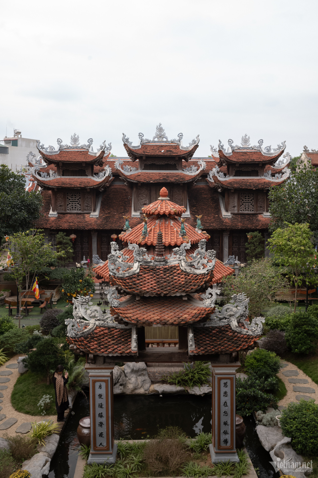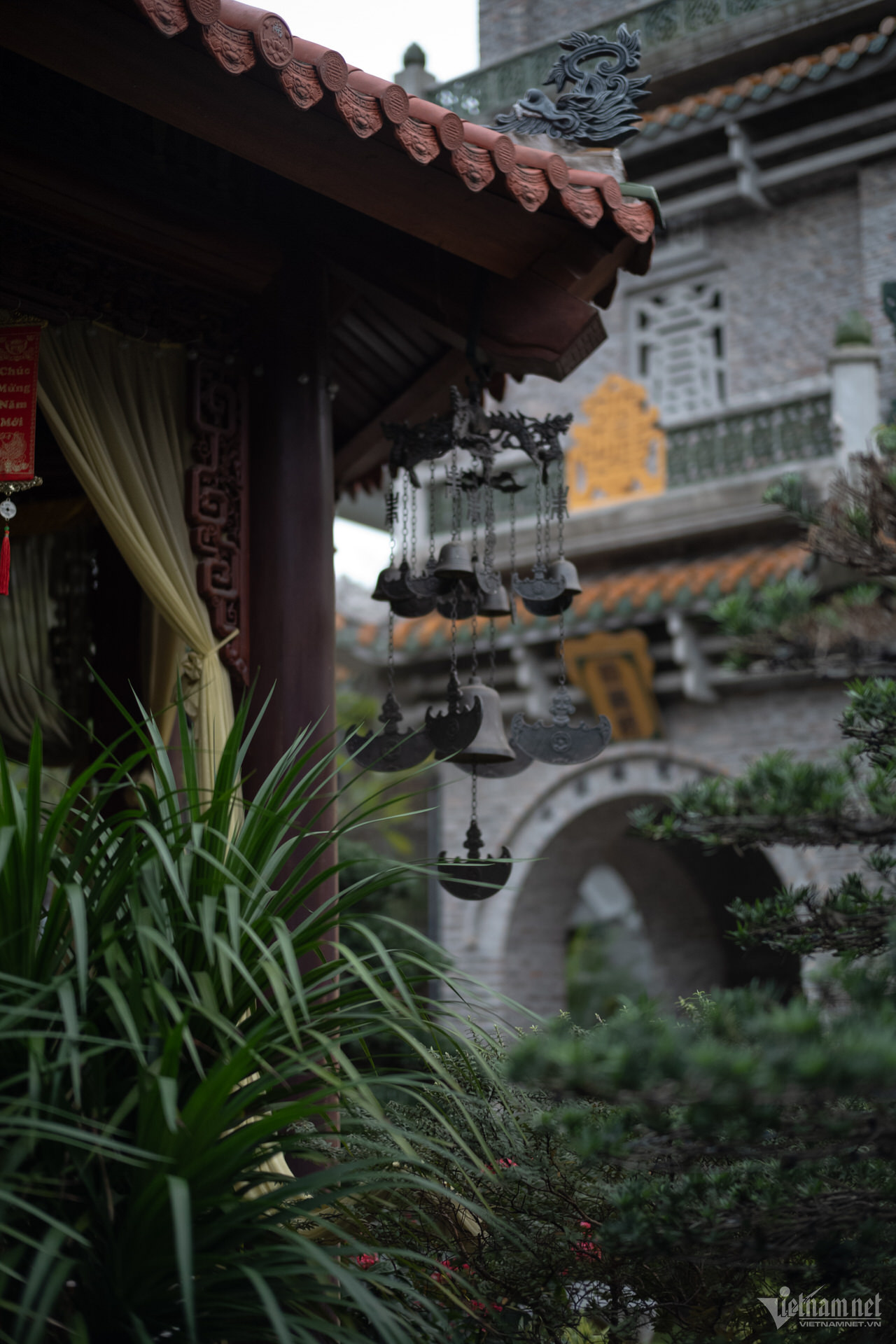 塔の三宝は高い屋根の上に建てられており、正面には観音菩薩像が安置されています。前殿エリアは5つの区画と2つの翼で構成され、マッチ積みのスタイルで3階から2階まで上がり、7区画の中ホールと3区画の上殿に直接接続されています。上宮殿の裏庭の周りには迎賓館、総主教の家、修道士の家があります。