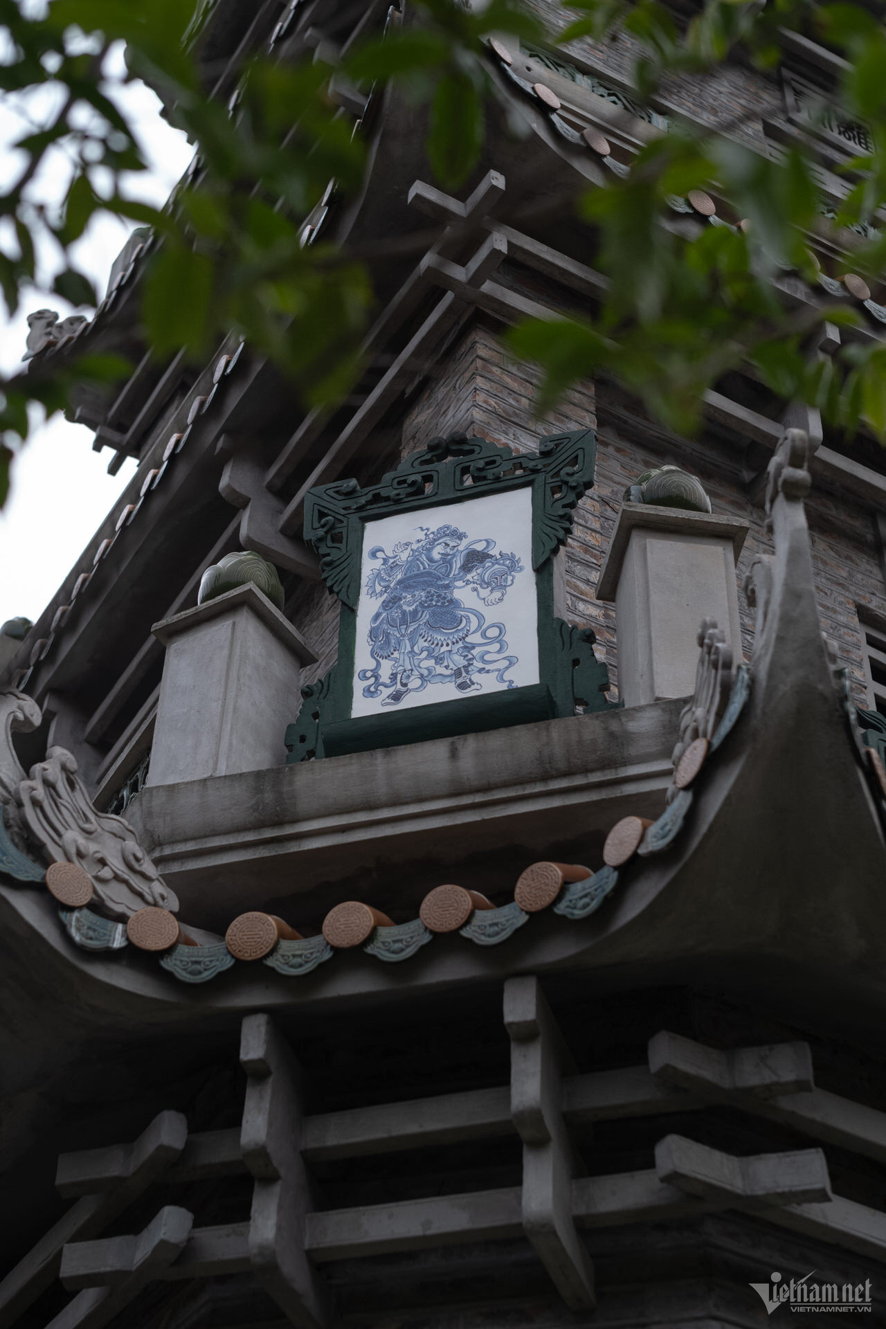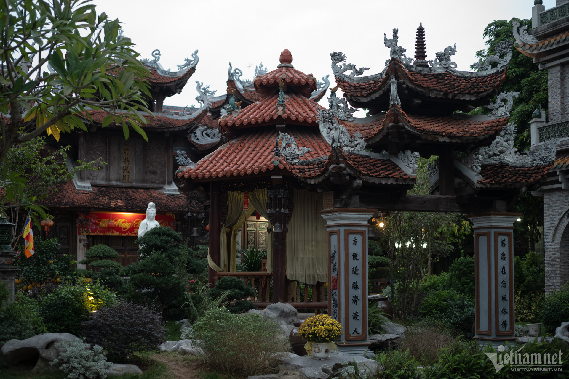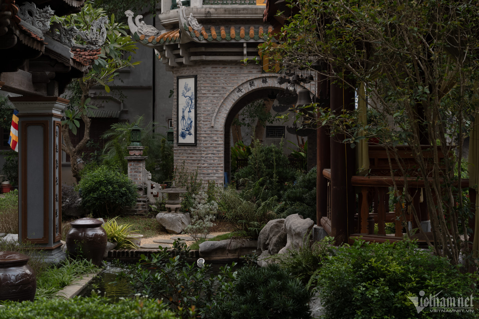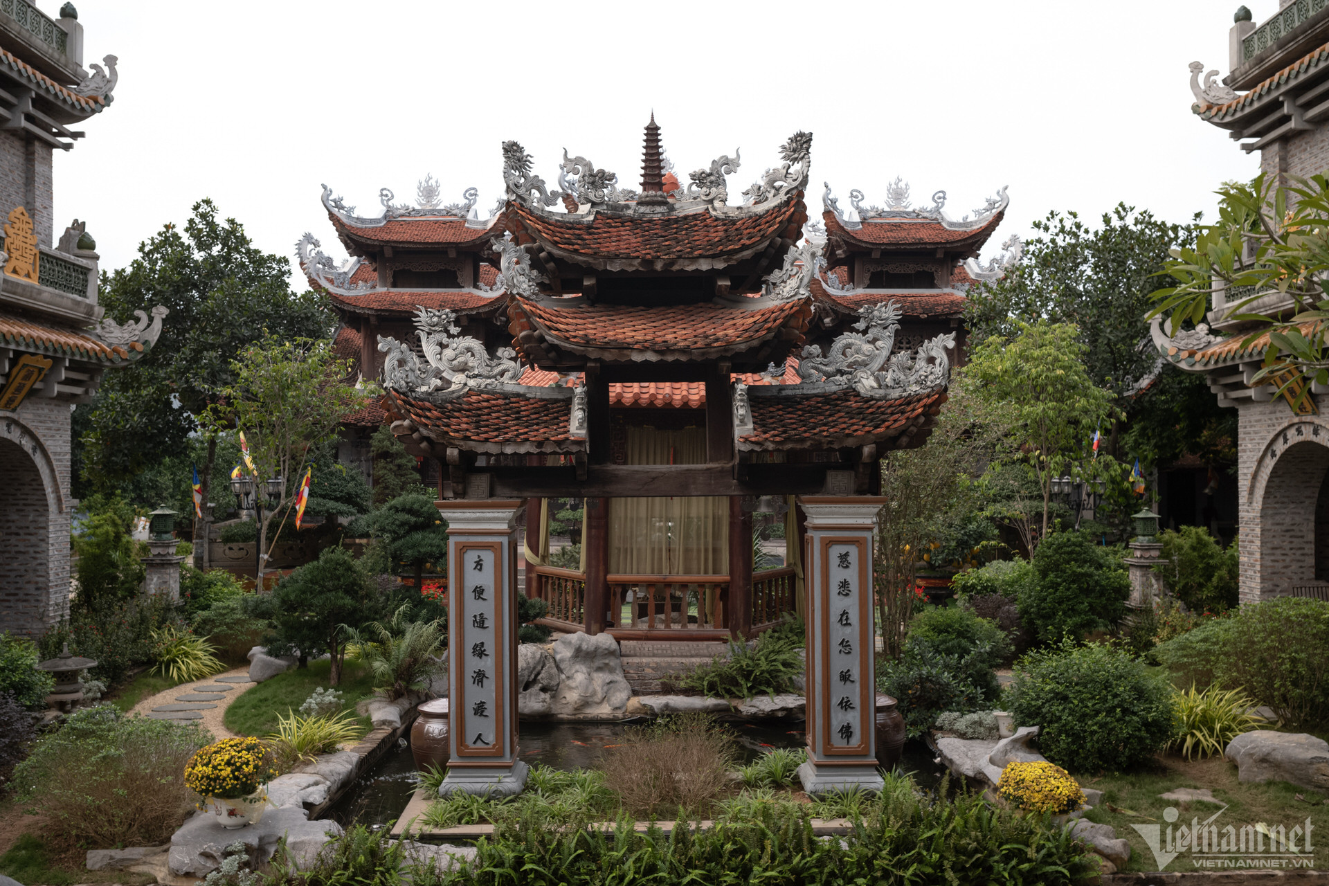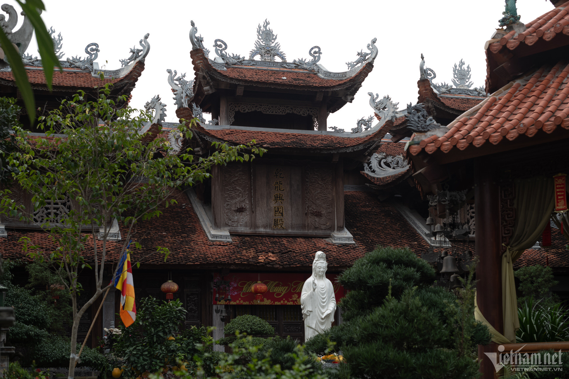 塔の三宝は高い屋根の上に建てられており、正面には観音菩薩像が安置されています。前殿エリアは5つの区画と2つの翼で構成され、マッチ積みのスタイルで3階から2階まで上がり、7区画の中ホールと3区画の上殿に直接接続されています。上宮殿の裏庭の周りには迎賓館、総主教の家、修道士の家があります。