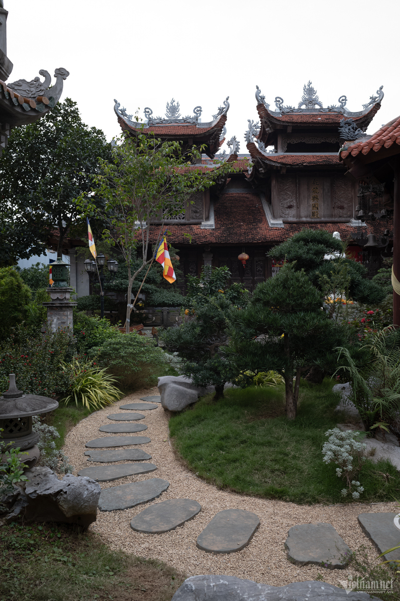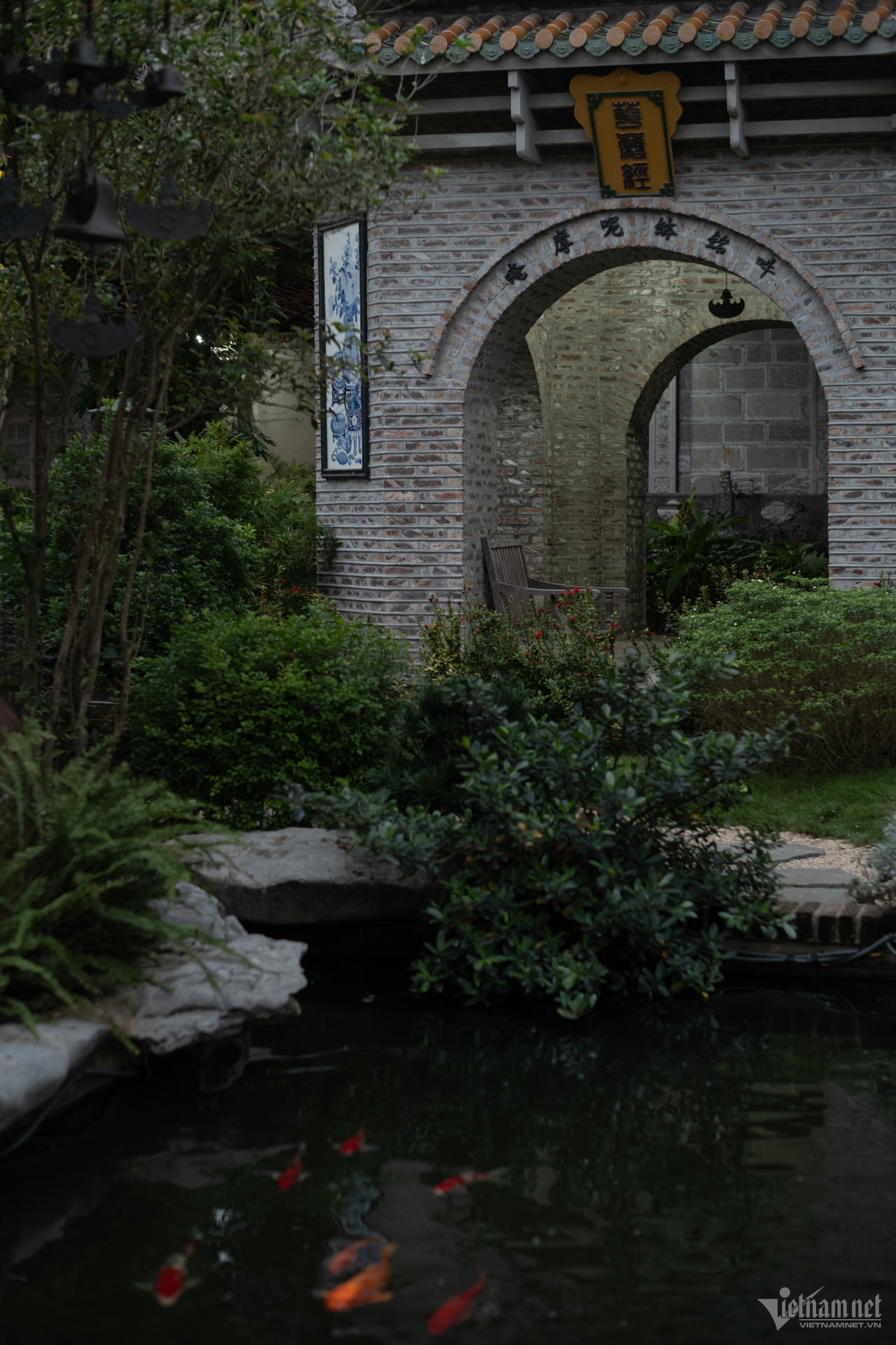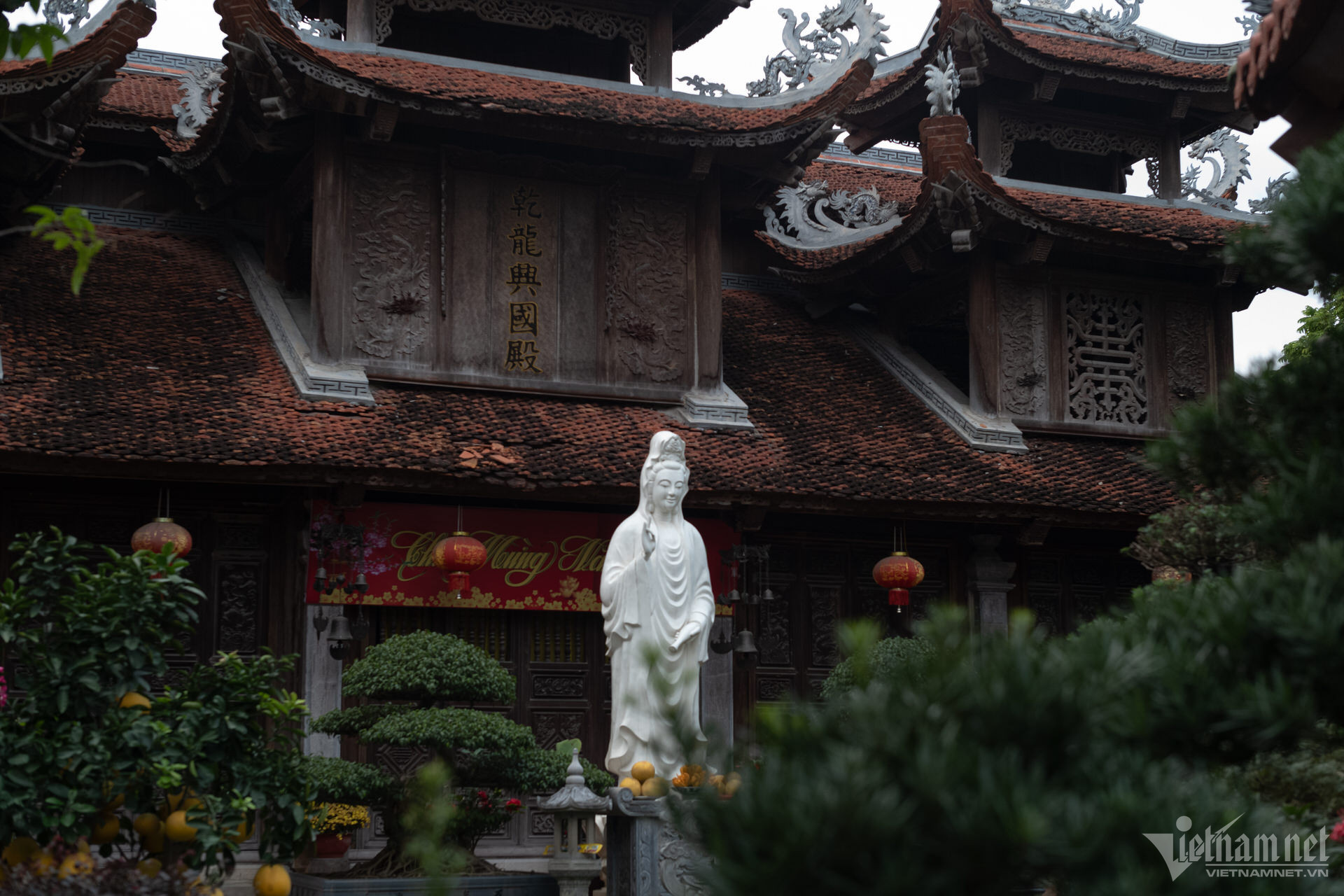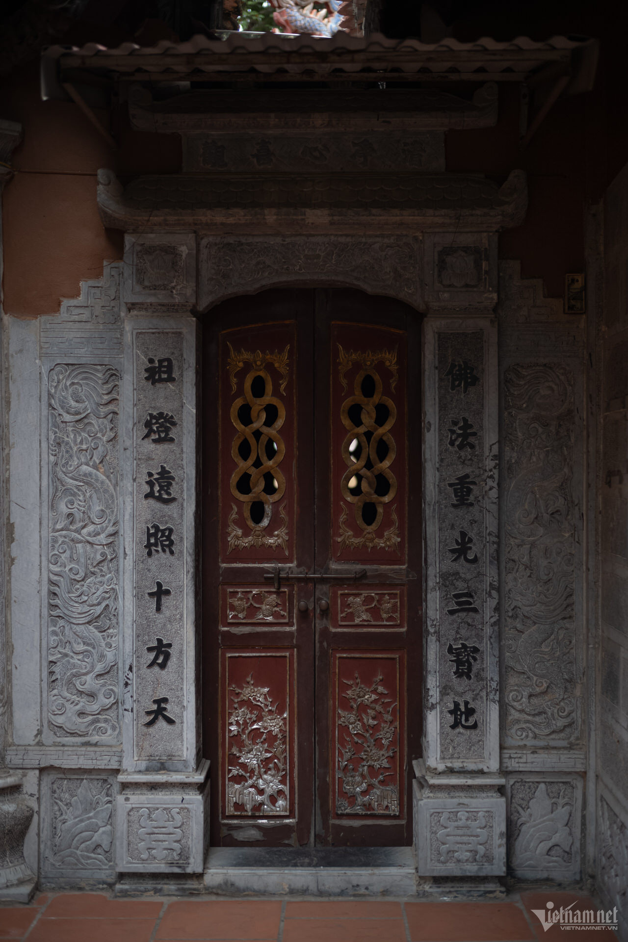 塔の三宝は高い屋根の上に建てられており、正面には観音菩薩像が安置されています。前殿エリアは5つの区画と2つの翼で構成され、マッチ積みのスタイルで3階から2階まで上がり、7区画の中ホールと3区画の上殿に直接接続されています。上宮殿の裏庭の周りには迎賓館、総主教の家、修道士の家があります。