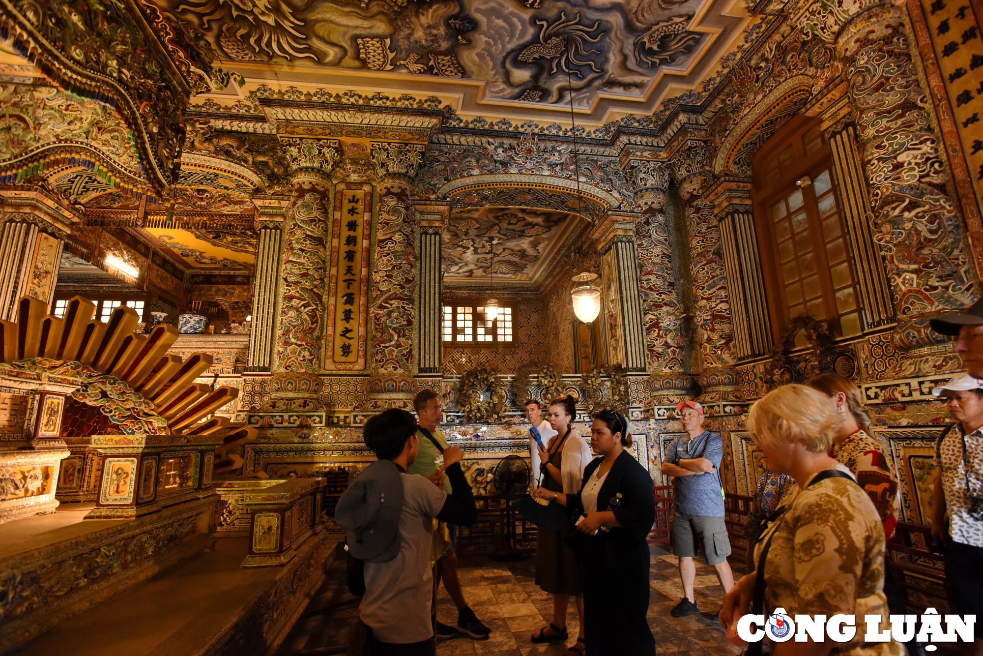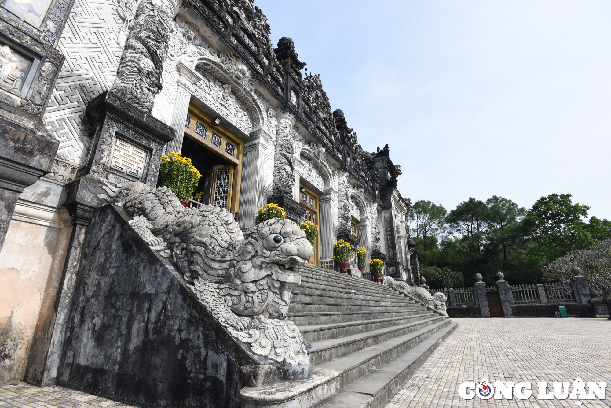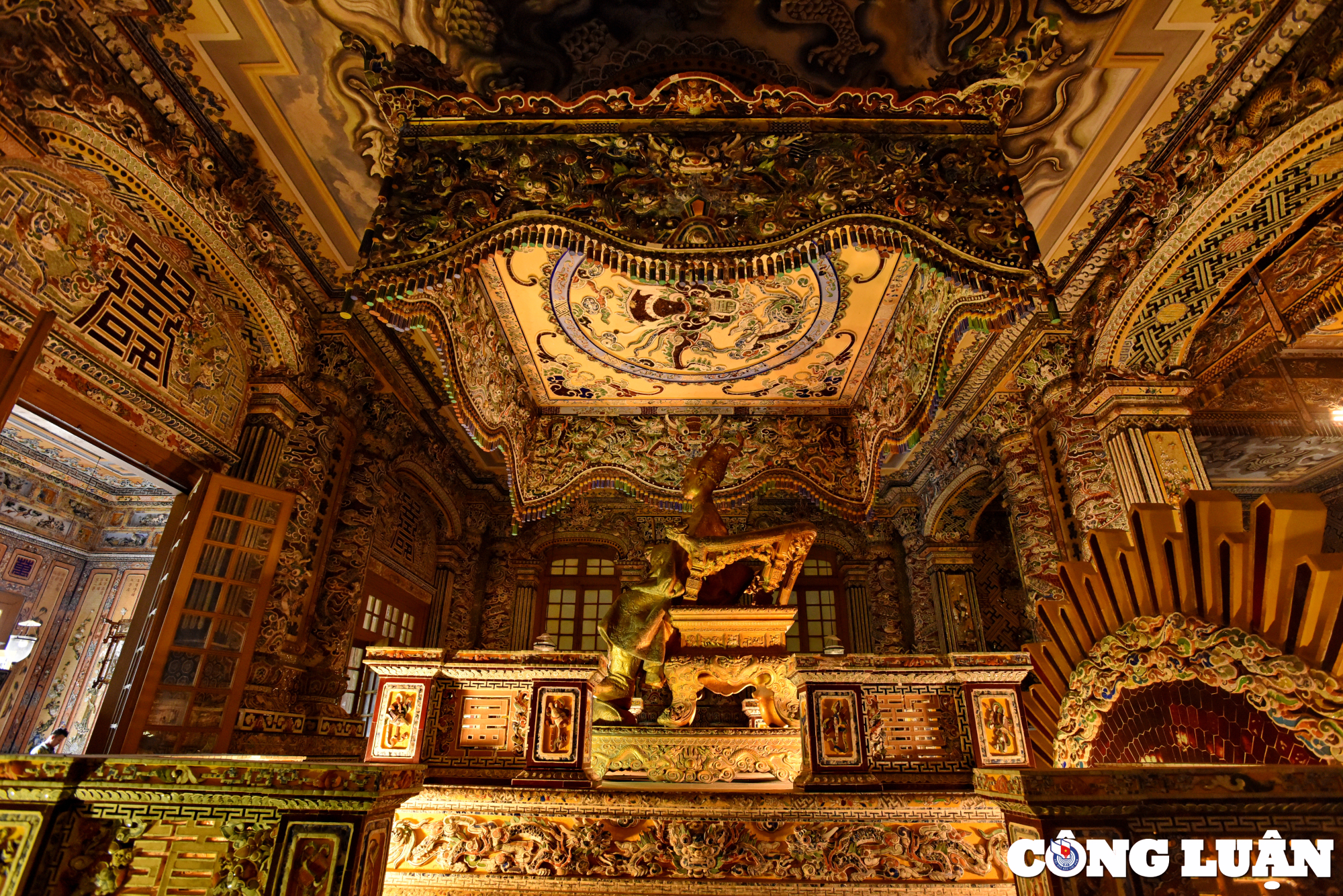 ティエン ディン宮殿の後宮とカイディン王の霊廟は、磁器で象嵌された龍、鳳凰、花、葉などの像で華麗です。