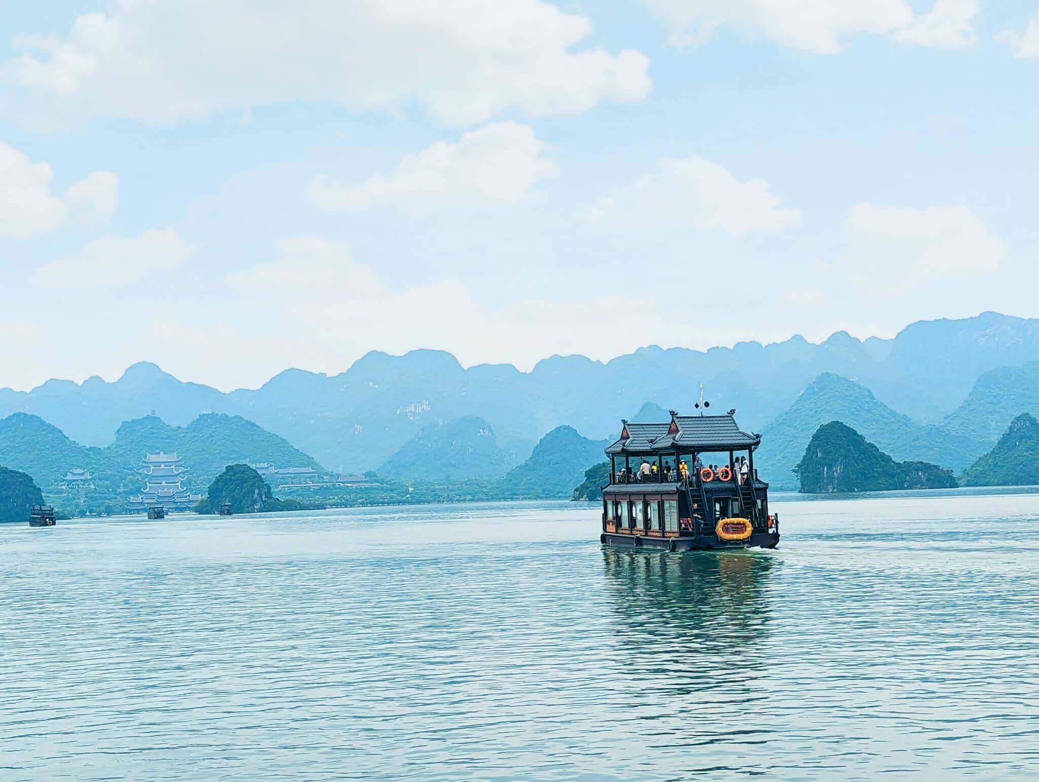 タムチュクパゴダはターティン山を背にし、タムチュク湖に面しており、湖面には6つの石の島がそびえ立ち、非常に雄大な景観を作り出しています。