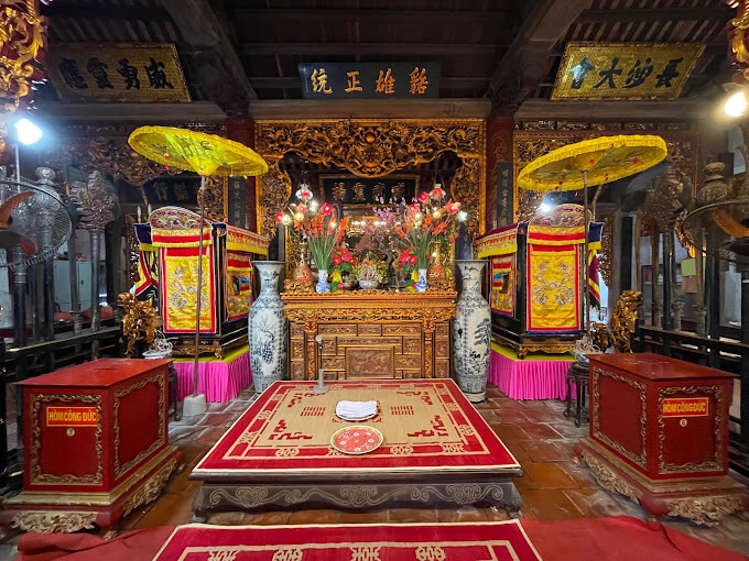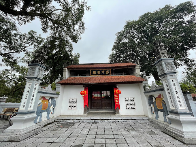 国際寺院、ハイ バ チュン寺院としても知られるハット モン寺院は、ハノイ市フックトー地区のハット モン コミューンにあります。いくつかの記録文書によると、ハットモン地区は、ハイ・バー・チュンがフォンチャウ城塞で会合した後、兵士たちの結社を組織した場所である。ここは、蜂起が失敗に終わったハイ・バー・チュンが亡くなった場所でもあります。 伝説によると、ハット モン寺院はハイ バ チュンが永遠の領域に転生した後に建てられたと言われています。寺院は南西に面しており、主要な建築作品が含まれています:ティエンクアン、仮寺院、儀式の門、フオン共同住宅、誓いの祭壇、3つの門、前祭壇、中央ホール、ハーレム、左右の堀、隠し塚、グエン・ティ夫人ディンの記念館、ゲストハウス、別館... Quan Tien: 小さな建物で、レンガ造りで、ドアはローリングドームスタイルで寺院に向かって開き、湾曲した屋根があり、床は路面より 45 cm 高く、レストランの床まで 3 つの階段になっています。村のおとぎ話によれば、この場所はもともと水上ケーキを売る店だったそうです。ハイ・バー・チュンの反乱軍が誓いの祭壇に集まったとき、水上ケーキを売っていた女性は、敵を倒すために戦いに行く前に二人の女性に食べられるよう、山盛りのケーキを差し出しました。この小さな店は、水上ケーキ屋さんへの感謝の気持ちを込めて、村人たちが建てたものです。 仮寺院:本寺院の右側前に位置し、祭壇とハーレムを含むディン型の平面を持つ。三室の祭壇は、切妻壁、瓦屋根、釘形屋根を備えています。セットは「銅鑼台・下段・七縁」のような構造になっています。 3 つの区画からなるハーレムの建物は正面祭壇に接続されて建てられており、屋根支持システムは正面祭壇と同じ構造になっています。前面はテーブルスタイルのドアシステムで開きます。この建築作品は聖母の仮住まいです。毎年の洪水期には、寺院の主要エリアが浸水し、村人は像、玉座、寺院のすべての崇拝物を仮寺院に移し、洪水期の終わりに再び聖宮殿を移設します。 外側の儀式の門: グエン王朝に遡り、4 本のレンガ柱の様式で作られ、柱の上部には 4 羽のフェニックスとユニコーンが浮き彫りにされています。提灯部分には四聖獣(龍、竪琴、亀、鳳凰)が型押しされています。柱本体には漢字の並列文が記されています。門から堤防の斜面に沿って下ると寺院の本陣があり、右側には湖があり、湖の真ん中に最近建てられた水の家(フォン共同住宅)があります。道路の左側の堤防表面にあるのは、女性将軍であり英雄でもあるグエン・ティ・ディンの記念館です。 誓いの祭壇:三門の門前に新設され、誓いの石柱は塔の形をしており、四面に漢字が刻まれ、庭の高さより65センチメートル高い基礎の上に置かれ、5段の階段があり、ハイ・バー・チュンの誓いの内容が刻まれた寺院に面しています。祭壇の周囲は中二階の壁で囲まれており、その外側には象や馬の石像が置かれています。 儀式の門: 3 つのマッチが積まれたコンパートメント、2 階建ての屋根で構成されます。寺院に入る 3 つの扉は板でできています。屋根の支持梁は「鉦架、下部パネル、7つのポーチ」の形で構造されており、屋根は瓦葺きで、床はバット瓦で覆われています。 石碑の家: 左右の家々の列の外側に、庭の高さより 30 cm 高い基礎の上に 2 つの石碑の家が建てられ、瓦屋根と 4 つの湾曲したブレードを備えた共同住宅の形式で建てられました。 左/右の砂漠: 寺院の庭に沿って 5 つの区画の各列が走り、切妻壁スタイル、瓦屋根、「鉦架、上下」の形の屋根支持構造が壁に配置され、隠れるための柱が追加されます。列柱。 大礼拝堂:5つの区画で構成され、切妻壁のスタイルでレンガで建てられ、屋根の支柱は「上部の銅鑼、重なり合う梁、コンミー、7つのポーチ」のスタイルで構造され、屋根の垂木は「上部」に分割されています3番目から4番目の下まで、屋根は瓦葺き、床はバット瓦です。建築上の装飾は、端、柱、脇の梁、罠、風よけパネルに、龍と四神獣をテーマにしたエンボス加工やフィリグリーの形で密集して施されています。これはレ・チュン・フン時代からグエン王朝にかけての芸術品です。中央の部屋には横板が掛けられ、柱にはすべてハイバの功績を讃える並列文が掛けられている。 正面祭壇: 切妻壁のスタイルでレンガで建てられた 5 つの部屋で構成され、床は庭の高さより 30 cm 高く、レンガの束で囲まれています。構造は「上部ポーチ、銅鑼ラック、下部ポーチ」です。 」。 ハレム: 3 つの部屋で構成され、庭のレベルより高い基礎の上に建てられ、切妻の壁と瓦屋根が付いています。この建物の屋上は橋の屋根を介して真ん中の建物とつながっています。屋根を支える木製のフレームは、4 組の「積み上げられた」トラスで構成されています。この建築の装飾は主に鳳凰です。禁断の宮殿の中央スペースは、木の板で覆われた木箱で作ら
