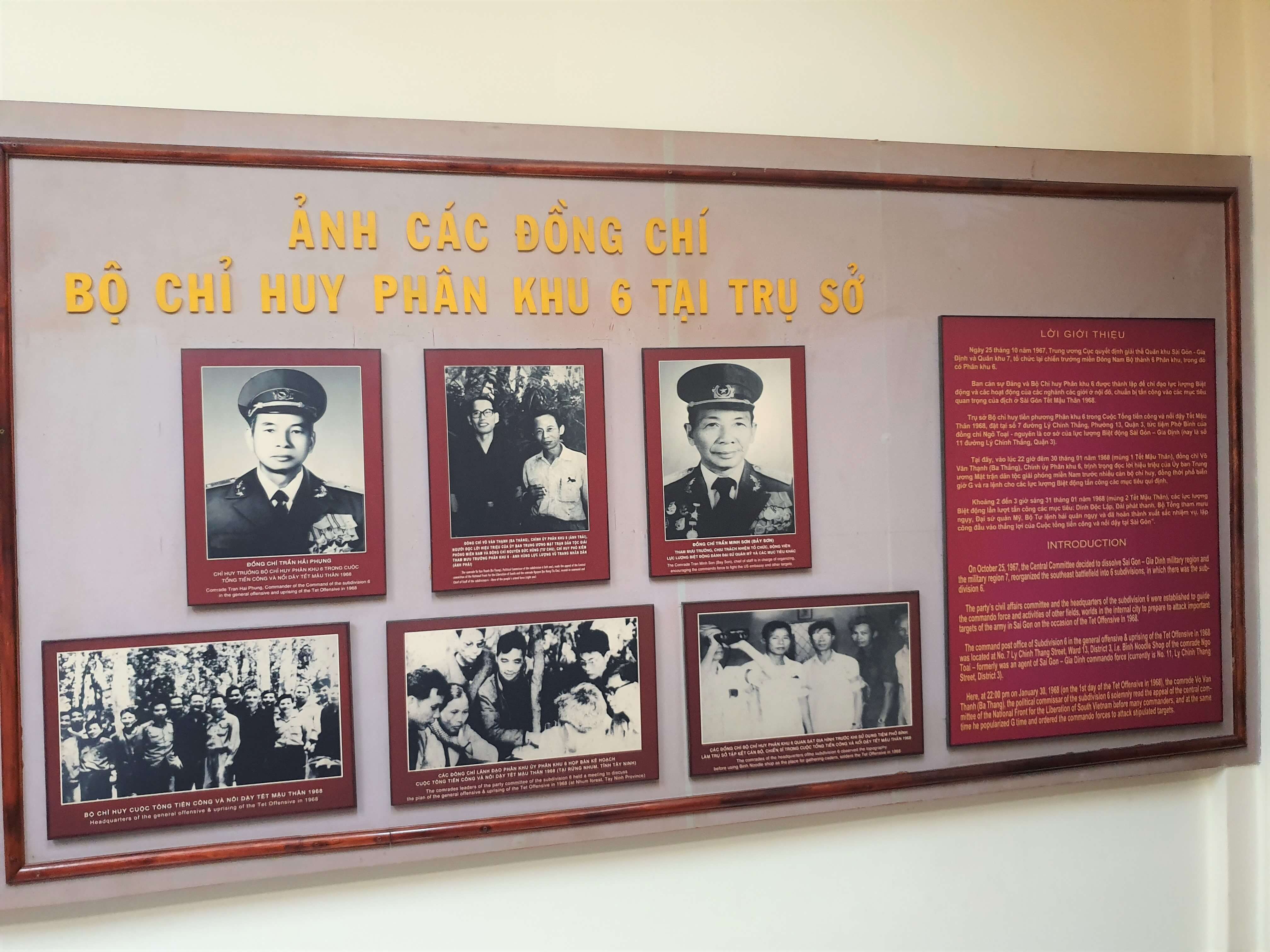 軍事本部 - ディビジョン6(サイゴンの特別ゾーン - ジアディン)は、麺屋を使用して兵士と役人の本部になることを決定し、1968年のXuanの一般的な攻撃と反乱の命令を伝えました。 モニュメントは、フォービンショップ、No。7Yen Do Street(現在はChinh Thang Street)、第8区、Ho Chi Minh Cityです。それはタウンハウスです:1つの地面、3階、1つのテラス。 1階にはエリアがあります:4m x 19m後、中央には石の階段があります。 1階は、フロントコリドーの半分を占めるキッチンのデザインによると、ヌードルショップとして使用されています。ダイニングテーブルのレイアウト内で、道を中央に残します。キッチン、トイレ、湖を隔離し、階段が床に続く1,2,3に通じています。各フロアは2つの部屋に分かれています。前部の部屋(3m x 3.5mの面積)と後部部屋(3m x 4mの面積)です。テラスの鉄のはしご。各フロアには、サイズ1.2m x 4mの3つのフロント列が竹のフルートで外側にシールドされています。 Pho Shopは住宅センターにあり、広々とした、顧客は比較的混雑しているため、コミュニケーションと受信文書の基礎として使用される特別なユニットです。特別チームの3人の兵士も、ヌードルショップのメイドとしてアレンジされました。 1967年以来、ビジネスヌードルショップに住んでいるか、数日間会っている多くの役人や兵士がいました。 Tetの休暇の約1か月前、Hai Tri氏はヌードルショップに行き、Ngo Toai氏に1か月で約100人のユーザーを緊急に予約するよう指示しました。命令に準拠して、Ngo Toai氏は、30テットマウの夜に(1968年)よりも30テットマウの夜に食物と食べ物(ドライフード、ボックス、チキン、生の鴨など)を保管し、サブディビジョン6の専門的なユニットを命じ、7円を命じました。 Hai Tri(Nguyen van Tri) - J9クラスターの政治家(A30、バトル保証ユニット); Ba Black(Ngo Thanh Van) - キャンペーンの第1段階で第11特殊部隊のキャプテン(アメリカ大使館と戦っている部隊)。 Ba Phong(Do Tan Phong) - 679レンジャークラスターの司令官(キャンペーンの第1フェーズ)。 ...そして、武器、情報を輸送するために勤務している役員と兵士 - 暗号と軍事医療。月の新年の初日(1968年1月30日)、ゾーン6の政治委員会(Vo van Thanh)氏(Vo van Thanh)は本社に向けてユニットを指揮しました。旧正月の初日の夜、家の3階、役人、兵士、施設、クラスターの指揮委員会、特別チーム、サービスユニットは十分に集まり、攻撃の命令を待っています。 23:30、ディビジョン6の指揮を代表して、Ba Thang氏は南部の中央委員会の信号を読み、サイゴンのアメリカ帝国とミニオン政府の頭の標的を攻撃するという課題のクラスターを広めて発行しました。 MAUの2つの新年の朝、明らかにされた施設の兆候があることに気付いて、Ba Thang氏はここに力の分散を命じ、合法的な同志は留まり続けました。司令官が去った月の新年の3日目の朝、サイゴン軍がフォー・ビンショップを囲み、ミッションの要件に留まるために娘、息子、息子、13人の役人と兵士を逮捕しました。 Ngo Toai氏は、20日間敵に非常に残酷に拷問されていましたが、まだ何も告白しませんでした。彼はコンダオに追放され、1973年のパリ協定の後に囚人に戻されるまで革命に対する忠誠心を守りました。 レンジャー部隊のこの秘密の基地の遺物は、特別なユニットと内側の反政府勢力のために攻撃するコマンドを発行する場所であり、1968年の一般的な攻撃と反乱の重要な歴史的マイルストーン-Gia Dinhを記録しています。記念碑はまた、都心の愛国心の表現であり、革命的な将校と兵士の勇気と不屈の精神、特に建築と戦闘の特殊勢力です。 この記念碑は、1988年11月16日の決定No. 1288-文化/決定を通じて、文化省によって歴史的記念碑として認められています。 ホーチミン市のウェブサイトのソース。