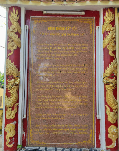 Tay Hoi Communal House(11区、Go Vap District、Ho Chi Minh City)よりも、サイゴンだけでなく南部地域でも最も古い共同住宅として有名でした。 Dinh Thong Tay Hoiは1698年頃に建設されましたが、これまで300年以上前になりました。神殿はベトナムの神の慣習を崇拝しています。主な神は、共同の家、ドン・チン・ヴォンとデュク・タン・キングで崇拝されていました。 1944年以前のテイホイの共同住宅は、ゴーVAP地区の古代の共同住宅であるハントンテイビレッジと名付けられました。共同住宅は1679年頃に建てられ、現在は古代ジアディンランドと南部の土地全体の最も古い共同住宅として知られています。 Tay Hoi Communal Houseは、19世紀の南に古代の構造を持つ共同の家です。共同住宅は、古代の共同住宅の構造と建設資材をほぼ無傷で保存しています。共同エリア全体は、5,188m2エリアにあります。住宅地に侵入されているため、約1,500m2しかありません。共同の家は東に向きました。共同の家は、タム・クアンのスタイルで建てられています。庭は幅が広く、高さ約10mの木がいくつかあります。共同住宅の建築地は、互いに並行して2つの軸を形成します。武道を含む長軸(主軸)、メインホール。短い軸(補助シャフト)が本部です。このタイプの建築地は、18世紀から19世紀の南にある宗教的な建築作品に非常に人気があります。メインホールには次のものが含まれます。家の2つのルールは、「カタツムリの偶然」のスタイルに一致しました。隣同士の2つの家の屋根。すべてに48の列があり、8列の列に分割され、それぞれ6列があります。最高の間の4つの列は4.5mです。直径は30 cm(しばしば「カルテット」と呼ばれる)が最も重要で神聖な場所であり、神の祭壇があります。メインホールの柱の脚には、真ん中にプリズムが刻まれています。メインホールの屋根には、レンガの壁があるメインホールの周りに、緑色のセラミックの長いバイプダル画像があります。本社は、取締役会、レセプション場所、犠牲のオフィスであり、水平サイズは12m、長さ19m、高さ4.2mです。 56の列、緑の石の柱の脚があり、3つの「カタツムリの一致」があります。倉庫のあるオフィスルーム用の板があります。陰のタイルとヤンのタイルで屋根が付けられた共同住宅全体に、木製のタイルが付いた木製のトラス、レンガ造りのベース(30 cm x 30 cm)があります。メインホールに集中している最もユニークな部分であるTay Hoiの共同住宅の装飾。ここでは、トラスとトラスにはドラゴンヘッドとアプリコットの枝が刻まれています。 3つのバッグがあります。中央のバオラムは、lan -ly -quy -phungのトピックに触れ、両側の双方が形の主題に触れます - hemoが触れます。最もユニークな彫刻は、メソポタミアの長いトリュー・ヌグエトとlan -ly -quy -fungのトピックに従って絶妙に刻まれた崇拝のページです。また、2つの礼拝ページ「Chung Linh Luu Tu」もあります。メインホールにはココナッツトランクがある2つのカプレットが貴重な芸術作品です。 Dinh Thong Tay Hoiの遺物、37の貴重なアーティファクト。アーティファクトは、Bao Lam、Hoanh Phi、Couplets、崇拝のページなどの芸術的な彫刻です。すべて、古代のアーティファクトの黄金の口紅の線と色を保持し、他の一般的な共同住宅のように口紅の新しい層に広がっていません。 建築芸術、歴史、社会の価値により、共同住宅は、1998年に文化と芸術の芸術的記念碑として文化と情報省によって認められました。 ホーチミン市のGO VAP地区の電子ポータルのソース。
