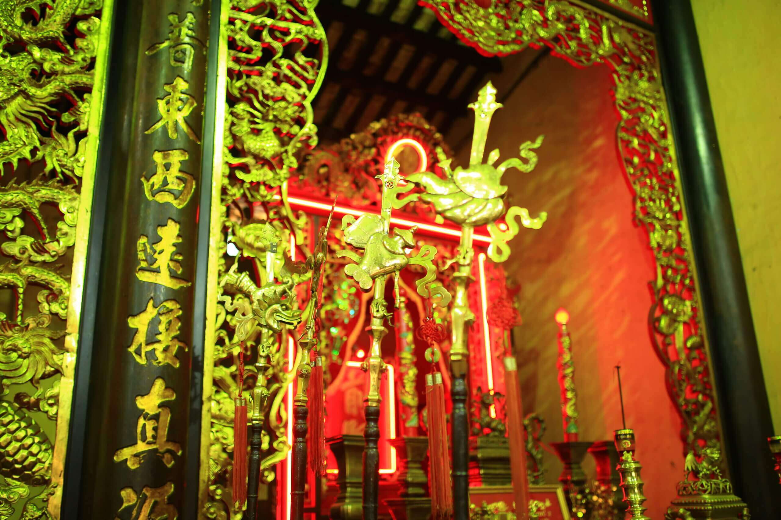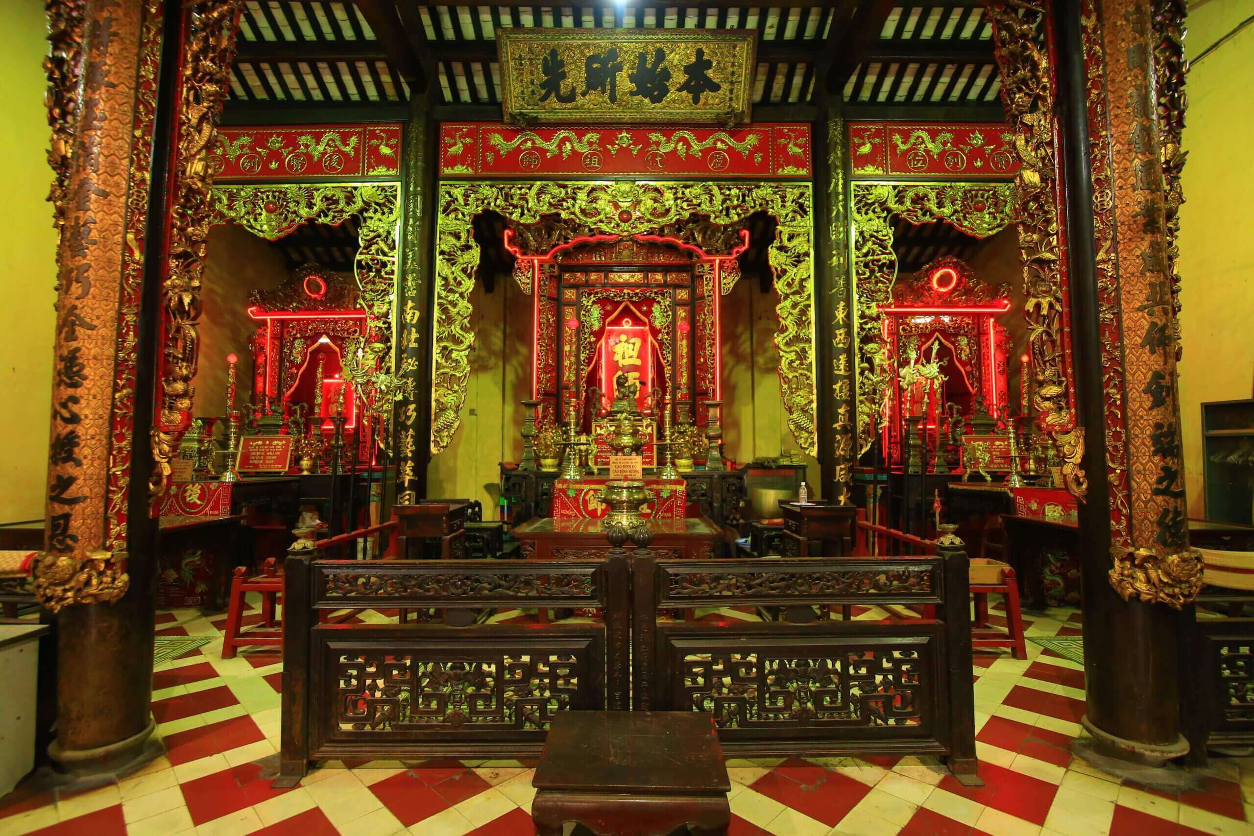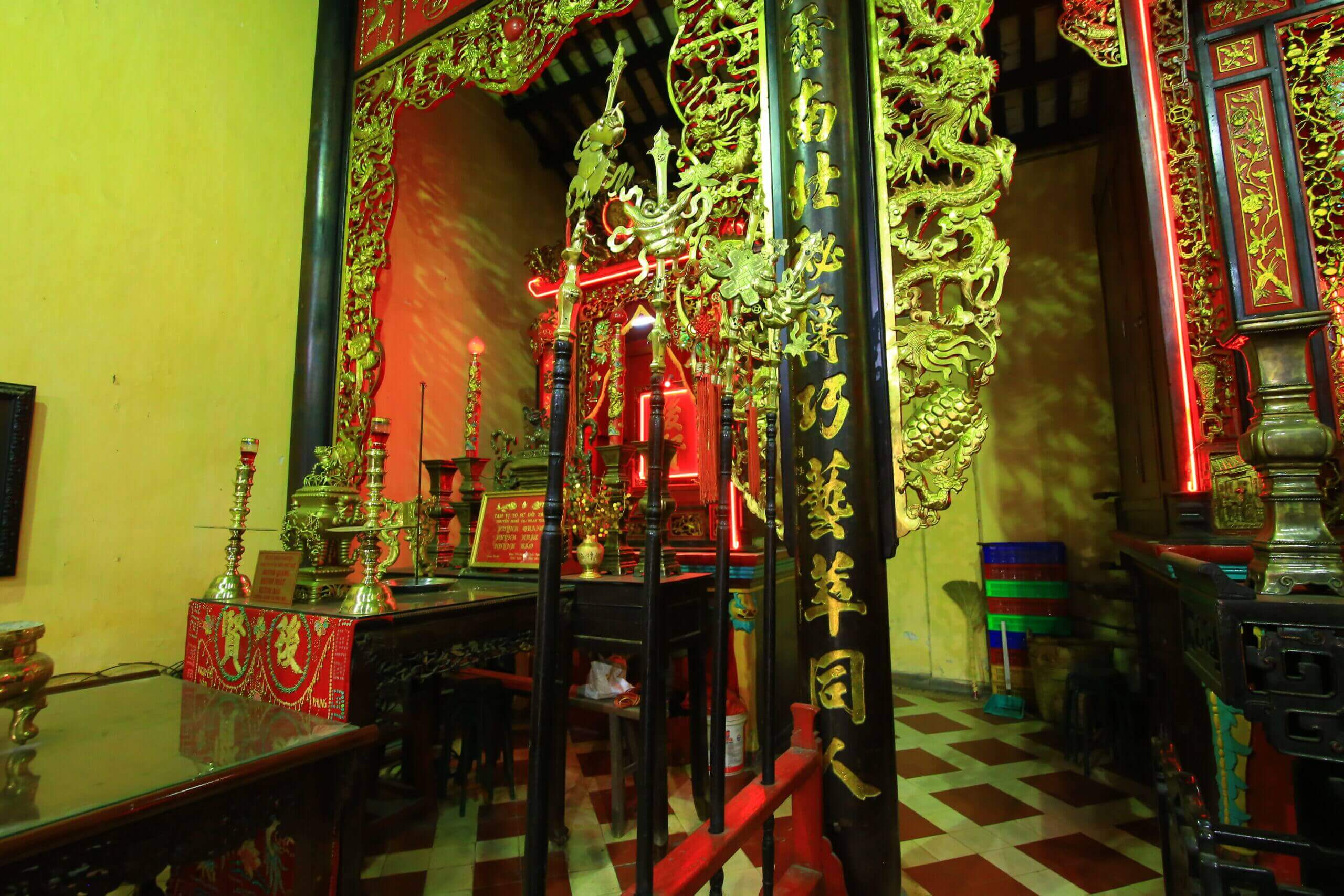 サイゴン - ホーチミン市のシルバークラフト教会であるルチャウホイクアンは、ホーチミン市5区、第14区、586 Tran Hung Dao B Streetの805m2エリアにあります。これは100年以上存在していた家であり、サイゴンと南部地域に建てられた最も初期の銀労働者教会です。著者のヴオン・ホン・センは次のように書いています。「ヌグエン・トライ・ストリートはル・チャウ・パゴダに会うためにプオンの知事の道を出ます。これは労働者のグループとkiの所有者のマスターを崇拝するための「パゴダ」です。 (今日のキミング業界は、国内の銀の労働者、フー・トゥン・シルバーの労働者がいます。ほとんど、多くの人々、彼らは水路で正方形の土地を買うことに貢献しています(今日、トラン・ハング・ダオ・B・ストリート)。祖先教会は1892年から1896年まで開始され、完成しました。祖先教会は、1920年、1934年、1946年に多くの大規模な修復を経験しています。最後の主要な修復は1968年8月で、メインホールのすべての意味と主要な修理が損傷によるものでした。メインホールは、3つの垂直スペースの構造に建設されており、外側から内側、レンガの壁、陰Yangタイルの屋根の2列の列があります。メインホールのレイアウトはシンプルで、彫像はありません。メインホールのメインフィールドは、ドラゴン、フェニックス、花、そして精巧な3つの礼拝試験を行いました。真ん中には、美しく美しい方法で書かれ、金で描かれた「祖先」という言葉があるアイテムとタブレットを崇拝する代わりに大きな教会があります。双方は2つの小さな礼拝試験であり、「ティエン・ハイエン」という2つの言葉を崇拝する権利、「hau hien」という言葉の左側にある礼拝です。柱の外側から内部へには、6つのカプレットと9つのダイヤフラムがあり、家長への感謝のトピックに焦点を当てたコンテンツがあり、銀の労働者の繁栄を称賛しています。すべてのダイヤフラム、カプレット、バオム...は、高品質の黄金時代の高品質の金色の漆で塗られているので、それらはすべて長い年を持っていますが、光沢があり、明確です。先祖の教会には、いくつかの非常にユニークなアーティファクトがあります。高さ1.10m、直径0.60mの大きなドラム、ドラムは木製の断片に等しくなく、大きな丸い木の木です。ドラムに付随するのは、ハノイ労働者によるヤギの年(1895年)のベルにある高さ1mのベル、0.50mの直径0.50mであり、銀行労働者の職業の14人のフルネームが祖先に敬意を払うことを明確に述べました。特に、メインホールの2つの壁には4つの石の幹が配置されています。 1895年にさかのぼってプレートがあり、1916年と1920年のプレートがあります。ステルは、名前、名前、地元の名前、先祖教会の建設に貢献した金額を刻みました。それにより、州の南部に銀の労働者の弟子がいます:テイコン、デンガン、トラヴィン、ベントレ、カントー...中国人とベトナムの人々。 Thinh Duc、Kim Phuoc、Duc PhatなどのHan Nom Characherの名前に加えて、次のような非常にブランド名もあります。このシルバーマスター教会の伝説によれば、Tranファミリーのネイティブ(未知の名前)を崇拝するために建てられたこのシルバーマスター教会の伝説によれば、宮殿の元の労働者から学んだ宮殿から学んだ宮殿から学びました。 1810年のキング・ギア・ロング・フォンによる「最初の家長」と「セカンド・マスター」Cao Dinh Huong(1773-1821、1821年にキング・ミン・マン・フォンによるブランド「セカンドマスター」)。キム・ホアン・ホイ・クアンの死亡記念日は、2月7日(月のカレンダー)に開催されました。ここの毎年恒例の礼拝日は、州の南部地域全体から銀の労働者の多数の弟子を集めました。死の記念日は、2月6日から8日まで3日間開催されます(月カレンダー)。 1世紀以上が経過し、先祖教会は理事会と銀労働者の弟子たちによって保存されてきました。この家は、「宗教宗教」、「源泉を覚えている水」の伝統を崇拝する普通の場所であるだけでなく、闘争の歴史と古代サイゴンと南部地域の開発プロセスに関する大胆なユニークな文化的特徴でもあります。そのため、「Le Chau Hoi Quan」は、1998年8月31日の文化情報省 - 1998年の決定No. 1811/1998/決定の下で、文化情報省によって建築および芸術的記念碑としてランク付けされています。 ホーチミン市の地区の電子ポータルのソース。