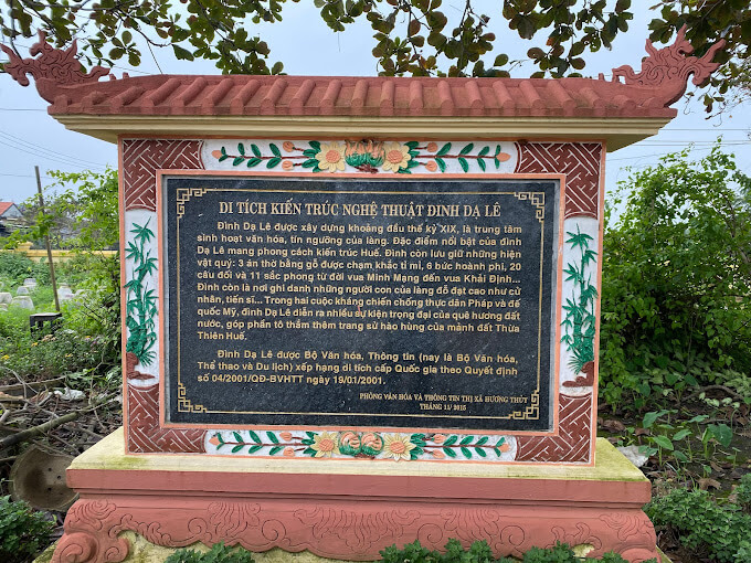 Da Le 共同住宅は、フエ市中心部から南に約 6 km、トゥア ティエン フエ県フエ市トゥイ ヴァン区にあります。 Da Le Communal House はミンマン 7 年 (1826 年) 頃に建てられた比較的古い建築物で、カイディン国王から「賞賛に値する良い習慣」を意味する「My Tuc Kha Gia」という 4 つの言葉を授与されました。 Da Le 共同住宅キャンパスの広さは 2,158 平方メートルです。共同住宅のレイアウトは、半円形の湖、象徴的な柱、スクリーン、垂直軸に沿って連結された大共同住宅で構成されています。ダイディンの建物は 2 棟の 3 コンパートメントハウスのスタイルで作られており、面積は 221 平方メートル (17 メートル x 13 メートル) です。トラス柱は木造で調和のとれた構造となっており、28本の大きな柱があり、そのうち最大列の柱(親柱)は8本、2列目(軍柱)は16本、そして3列目は16本となっています。柱の数(ポーチ柱)は4本の柱です。ディン・ダ・レーの屋根はやや水平でタイル張りで、「月の側面にある二頭の龍」の装飾が施されており、屋根の四隅には「龍の帰還」のシンボルが付いています。共同住宅の内部には、金で漆塗りが施され、細心の注意を払って彫刻された木製の祭壇があります。儀式用の門の 3 つのパネルには、グエン王朝芸術の典型的なモチーフが彫刻されています。 Da Le Communal House には、20 の対句と 6 つの横長の絵画がまだ保存されています。時間と戦争を経て、Da Le 共同住宅は何度も修復され、一部の木造建築は強化セメントに置き換えられました。ダ・レ共同住宅は、フエの民家様式を取り入れた伝統的な木造建築として価値のある典型的な建築遺物です。 Da Le 共同住宅は集会の場でもあり、村の伝統的な祭りや文化活動が数多く開催されます。特に、愛国運動や民族解放運動に呼応した地元の人々によって、多くの重要な歴史的出来事がここで起こりました。 この記念碑の建築的、芸術的、歴史的価値を考慮して、2001 年 1 月 19 日、文化情報省 (現在は文化スポーツ観光省) は決定番号 04/2001/ 決定 - 文化情報省を発行しました。情報により、Da Le 共同住宅は国家の建築および芸術遺物として認識されています。 出典: トゥア ティエン フエ電子情報ポータル。