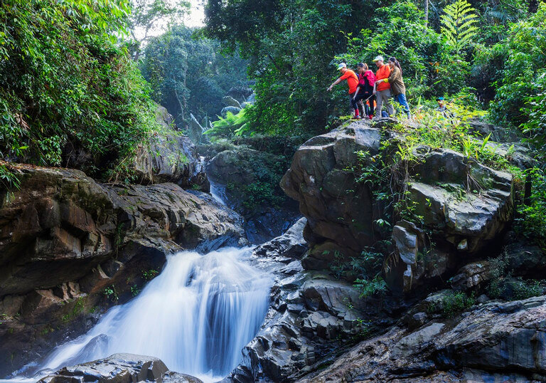 상록수림,많은 큰 나무,산과 숲 사이를 흐르는 장엄한 폭포로 인해 Dong Chau - Khe Nuoc Trong 자연보호구역에 시적인 아름다움을 만들어냈습니다.