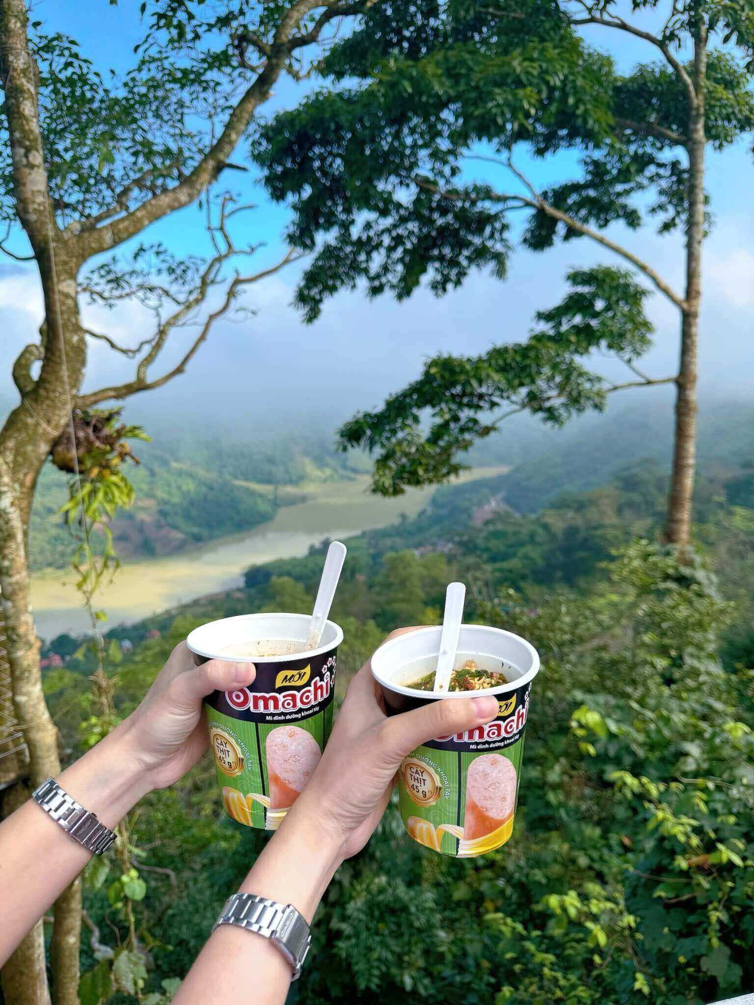 “몇 개의 작은 개울을 지나서 우리는 가장 아름다운 지점에 도달했습니다. 이번 시즌에는 나뭇잎이 모두 빨갛지는 않지만 충분히 추워요. 오르막길과 내리막길로 걷는 것은 상당히 피곤하므로 물과 간식을 준비해야 합니다. 1시쯤 산을 내려가기 시작했고 조금 피곤해서 점심을 먹으러 갔는데,물에 구운 고기와 홍합 당면을 곁들인 간식을 먹은 뒤 다시 휴식을 취했습니다.”라고 Ly Ly는 말했습니다. .
