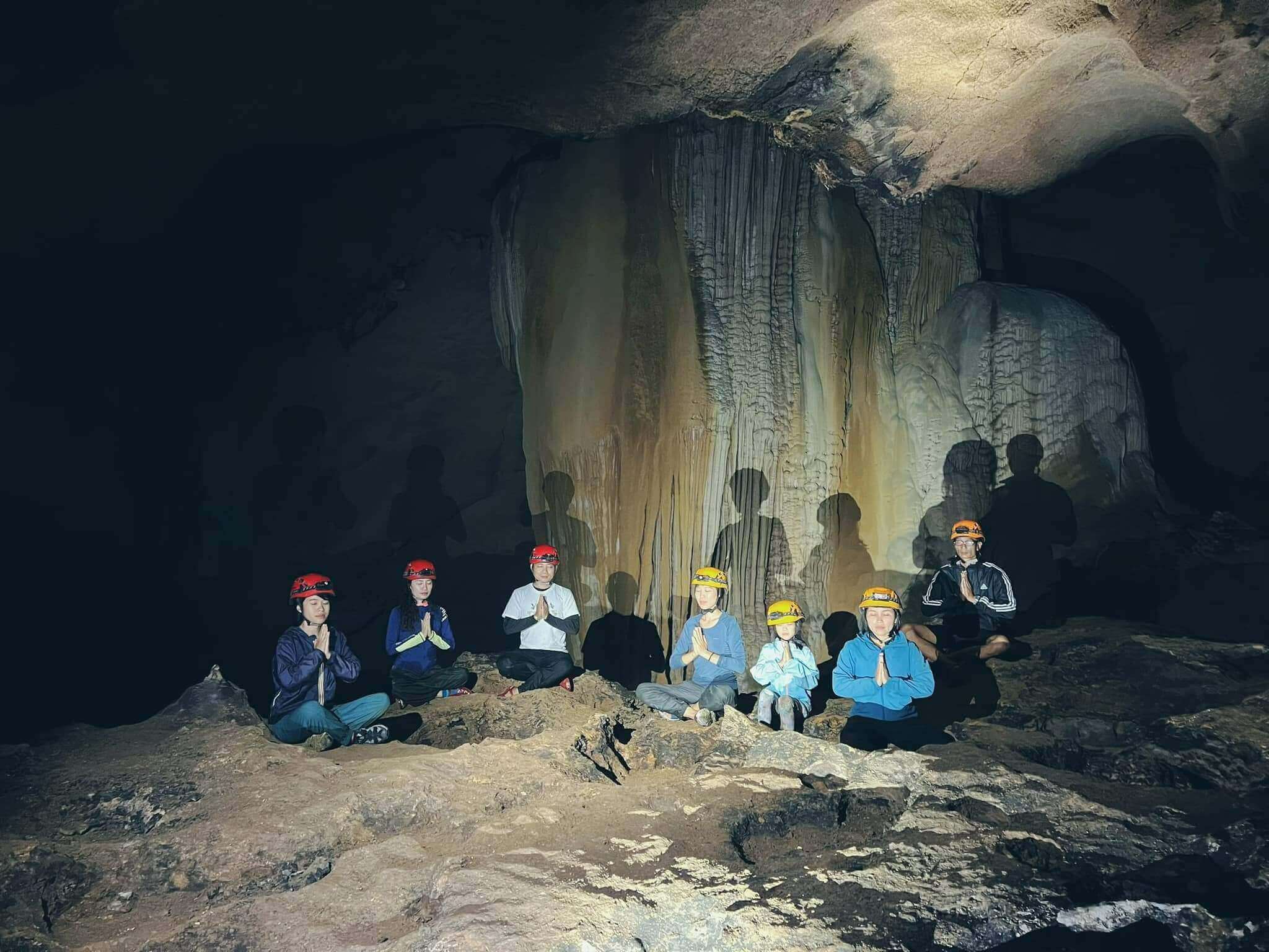 정오에 그룹은 휴식을 취하고 동굴에서 명상과 소리 연결을 결합했습니다. 종유석에서 물방울이 떨어지는 소리는 물소리를 만들어냅니다. 방문객들은 동굴 내부 지하수의 신비롭고 조용한 진동을 느낄 수 있습니다. 만트라 소리에 자신을 녹일 때 놀라운 승화감을 느낄 수 있습니다. Quang Binh 자연이 부여한 우주의 힘이자 원천입니다.