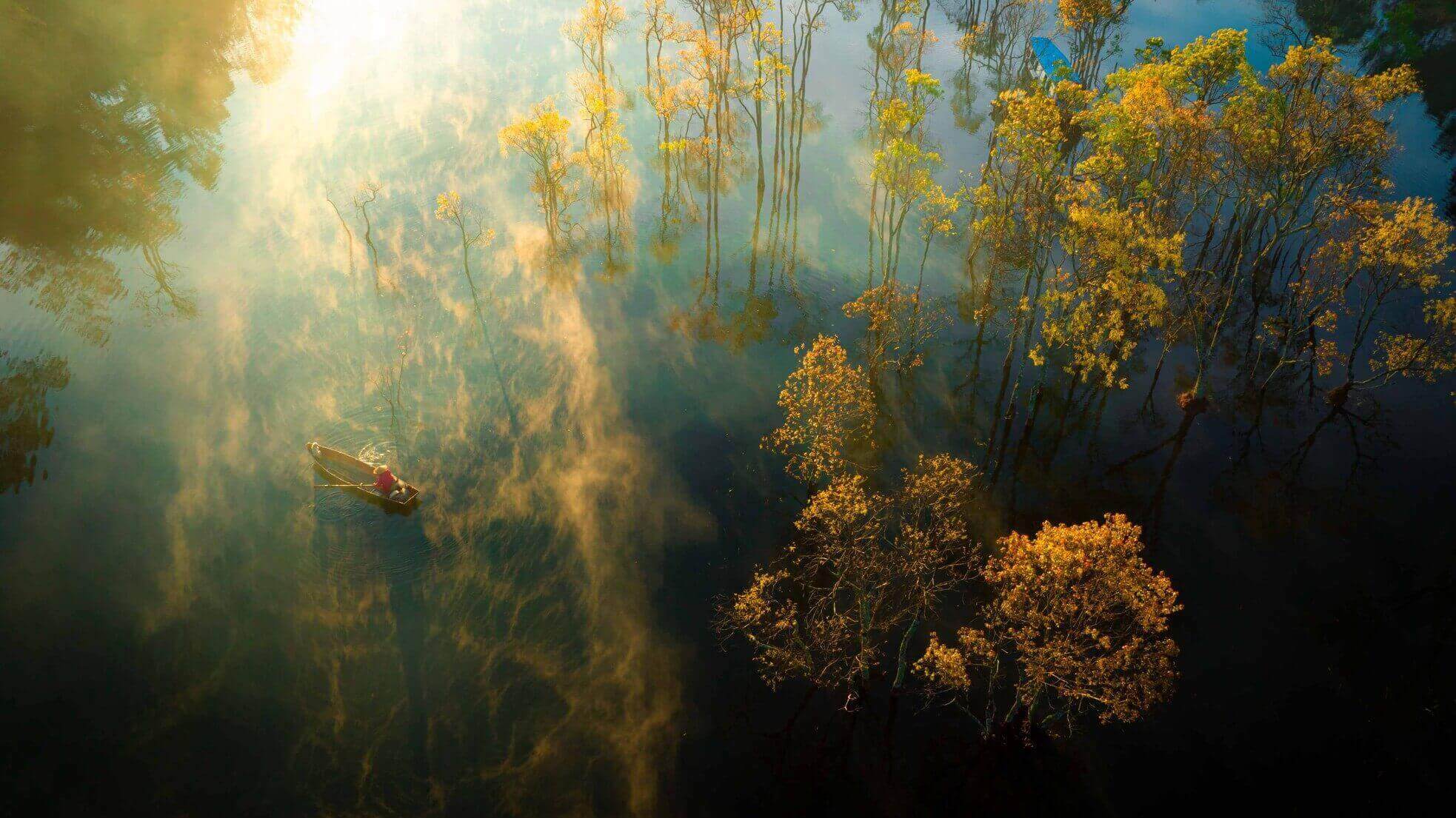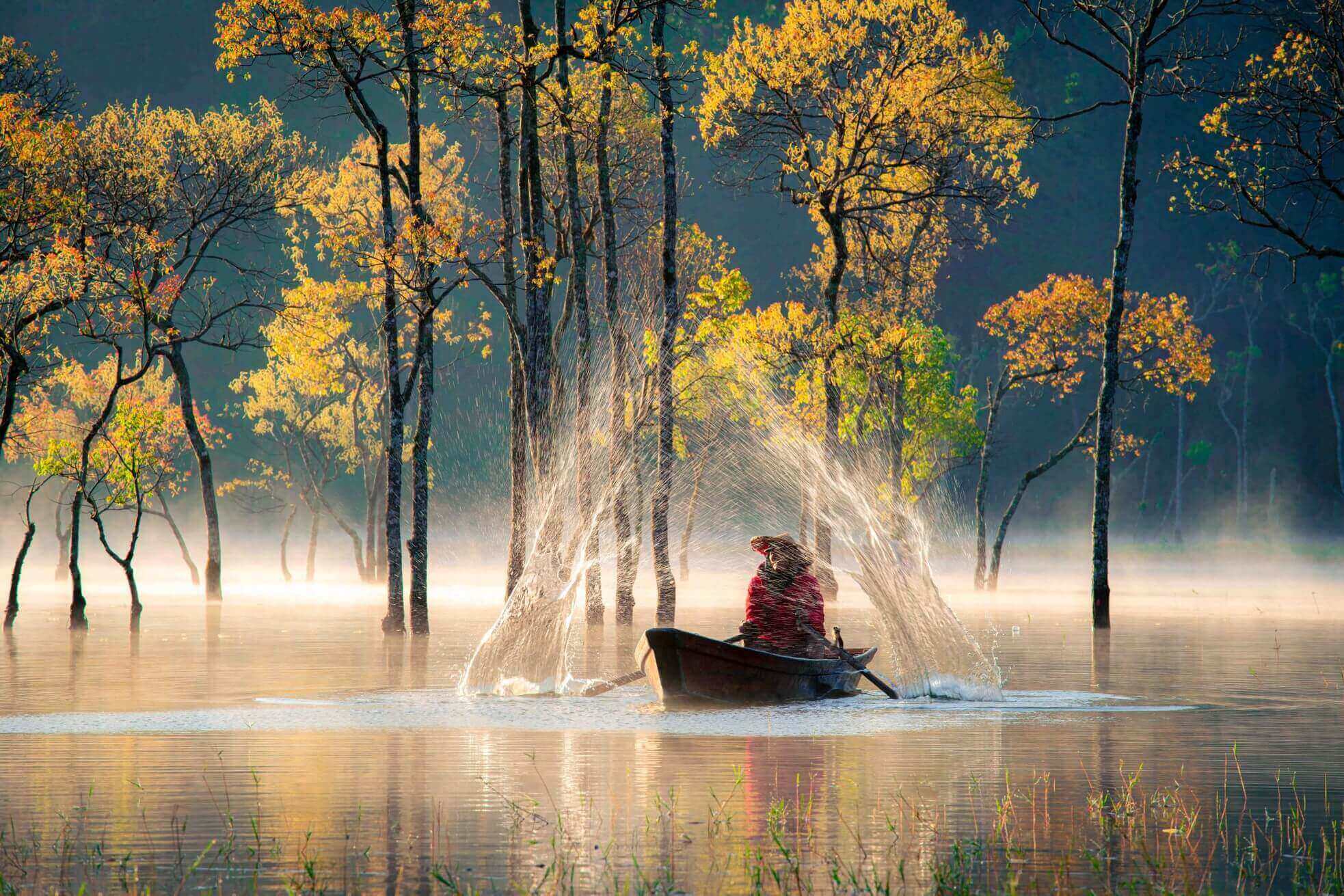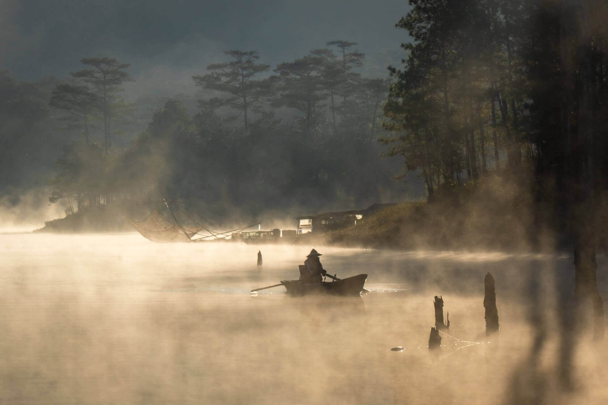 부이반하이 씨의 설명에 따르면,늙은 어부의 나무배가 안개 속을 유유히 미끄러지듯 나아가는 모습이 티아강의 공간을 더욱 환상적으로 만든다고 합니다. 사진: 부이반하이.