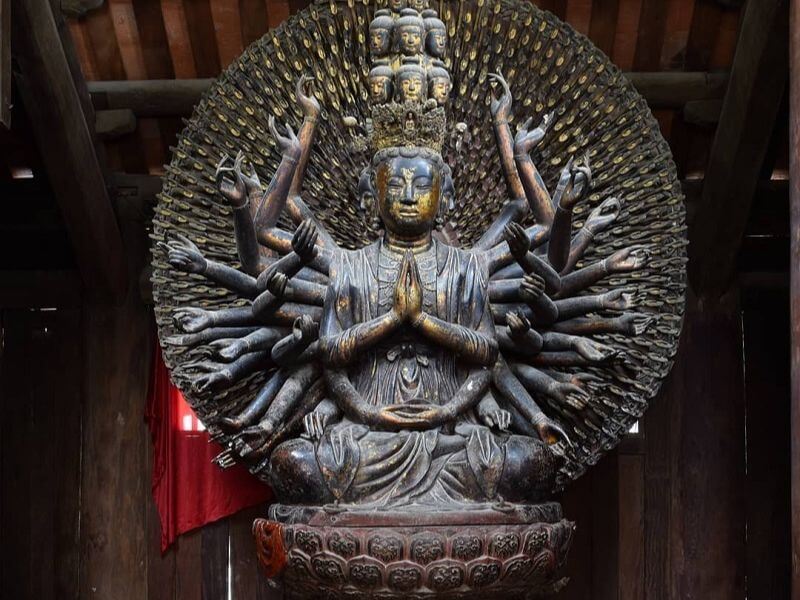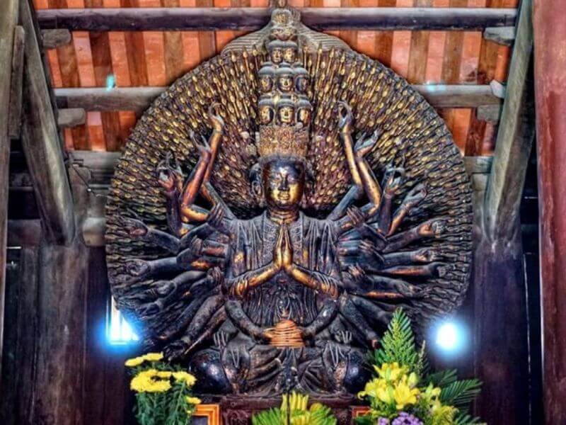 그러나 문자 그대로의 이름은 Ninh Phuc Tu입니다. 북부 삼각주에서 가장 아름다운 고대 탑 중 하나로 알려져 있으며 수도 하노이에서 약 30km, Dau에서 3km 떨어진 곳에 오늘날까지 비교적 온전하게 보존되어 있습니다. 탑. 이 탑은 박닌성 투언탄현 딘토면 붓탑 마을의 즈엉 강 남쪽 기슭 옆에 위치해 있습니다. 이 탑의 유적은 13세기로 거슬러 올라가며 Tran Thanh Tong 왕의 통치 기간에 지어졌습니다. Huyen Quang 승려가 시험에 합격한 후 중국어를 그만두고 이곳에서 수행을 시작했습니다(But Thap Pagoda - Bui Van) Tien은 또한 Tran 왕조의 탑 주지는 Truc Lam의 세 번째 창시자인 Huyen Quang 선사였습니다. 시간이 지남에 따라 탑은 여러 번 복원되고 장식되었습니다. 그러나 가장 큰 복원은 17세기 초 Le-Trinh 시대에 이루어졌습니다. 당시 이 탑의 주지는 추엣 추엣(Chuyet Chuyet) 승려(1633-1644)였고, 그의 제자 민한(Minh Hanh, 1633-1659)이 건축 양식으로 탑 전체를 대규모로 복원했습니다. 일, 외국 노동"을 행하고 있으며, Dieu Vien 왕후, Trinh Thi Ngoc Truc(Trinh King Trinh Trang 왕의 딸), Le Thi Ngoc Duyen Dharma 공주가 Dieu Tue와 Trinh Thi 공주를 지명하여 금전과 분야에 큰 공을 세웠습니다. Ngoc Co(이 사람들은 나중에 사원을 짓고 동상을 조각하여 사당에 두었고 오늘날까지 But Thap 탑에서 숭배를 받았습니다.) 이 복원 기간은 1644년부터 1647년까지 지속되었으며 탑은 문자 그대로 ""라는 이름을 갖게 되었습니다. Ninh Phuc Zen Tu". 18세기 초 붓탑사원은 이전보다 더 큰 규모로 수리되었다. Vinh Thinh 10년(1714년)에 지어진 비석 "Ninh Phuc Thien Tu Bi Ky"와 "Khanh Luu Bi Ky"에는 "탑은 관리들에 의해 추가로 수리되었으며, 좋은 것만 구입하기 위해 수천 개의 금을 구입하는 것을 주저하지 않았습니다"라고 기록되어 있습니다. 마을은 유리 세계로 장식된 웅장한 사원과 넓은 탑을 건설하고 수리하도록 기부하고 일꾼들을 초대했습니다. 이전에 비해 탑은 불전 뒤에 별도의 집이 늘어서 규모가 훨씬 커졌습니다. 1876년 뜨득(Tu Duc)왕이 이곳을 방문했을 때 거대한 탑을 보고 그때부터 붓탑(But Thap) 탑이라고 이름이 붙여졌습니다. But Thap 탑의 건축 단지는 광대한 논 사이에서 눈에 띕니다. 탑은 남쪽을 향하고 있는데 이는 불교철학에서 지혜와 반야의 방향이다. 가장 바깥쪽에는 3개의 출입구가 있고 그 다음에는 2층과 8개의 지붕이 있는 종루가 있습니다. 중앙 지역에는 모두 수평이고 평행하며 수직 축인 신토 거리에 배열된 7줄의 주택이 있습니다. 두 개의 복도(각 행은 26개의 방으로 구성) 사이에 위치한 내부 사원 내부에는 Tien Duong, Thieu Huong, Thuong Dien을 포함하여 외부에서 내부로 연결된 7개의 건물이 있으며 Thuong Dien과 Tich Thien Am을 연결합니다. 연꽃 연못(다리 길이는 4m이고 3개의 곡선 아치가 있습니다. 다리 표면은 녹색 돌로 포장되어 있으며 다리 양쪽에는 새, 꽃, 나뭇잎의 정교하고 정교한 돌 부조 12개가 있습니다.) Tich Thien Am Building은 이름에서 알 수 있듯이 좋은 것을 담고 있다는 의미입니다. Tich Thien Am에는 불교 수행의 9단계를 상징하는 나무 탑, 9층, 8면, 9개의 연꽃 꽃잎 등 9층의 연꽃 탑이 있습니다. 그런 다음 Trung 집, 예배 홀, 마지막으로 총 길이가 100m가 넘는 후면 홀이 나옵니다. Hau Duong 집 뒤에는 탑의 두 번째 종주인 Minh Hanh 선사의 유물이 안치되어 있는 5층짜리 11m 높이의 Ton Duc 석탑을 포함하여 일련의 석탑이 있습니다. 탑의 왼쪽에는 초대 총대주교인 추엣 추엣(Chuyet Chuyet)의 교회와 5층 높이 13m의 8면 바오 응히엠(Bao Nghiem) 석탑이 있는데, 이는 선 스승인 추엣 추엣(Chuyet Chuyet)의 묘지입니다. 바깥 쪽 끝 양쪽에는 현관을 따라 두 개의 비석 집이 있습니다. 이 사찰의 건축 작품 하나하나는 돌, 나무, 벽돌 등 풍부하고 다양한 재료를 이용해 장식적 모티브를 가미한 숙련된 예술 작품이다. 건축과 자연환경의 조화로운 결합을 표현합니다. 전반적으로 탑은 중앙 부분에 대칭적이고 촘촘하게 배열되어 있지만 주변 부분은 매우 자연스럽게 개방되어 있어 But Thap 탑은 고유하고 매우 독특한 특징을 가지고 있습니다. 특히 부트 탑(But Thap)의 고대 조각상 시스템에는 베트남 고유의 고대 보물이 있습니다. 그것이 바로 '천의 손, 천의 눈 - 천의 눈, 천의 손'이라는 불상이다. 높이 3.7m, 너비 2.1m의 이 동상은 머리 11개, 큰 팔 46개, 길이가 다른 작은 팔 954개로 빛의 후광처럼 팽창하고 솟아오릅니다. 이는 불상과 현대 조각 예술의 걸작으로 평가됩니다. 이 조각상은 편안하고 종교적인 자세로 용의 연꽃 왕좌에 놓여 있습니다. 우리나라 어느 곳에서도 볼 수 없는 이 탑의 특별하고 독특한 점은 넓은 평원 한가운데에 우뚝 솟아 있는 바오응엠 타워(Bao Nghiem Tower)라는 높고 웅장한 석탑입니다. Bao Nghiem Tower는 황량한 하늘에 곧장 뻗어 있는 거대한 우리와 같습니다. 탑의 높이는 13.05m이고, 5층은 꼭대기 부분이 녹색 돌로 되어 있고, 5층의 5개 모서리에는 5개의 작은 종이 있고, 탑 주위는 선명하고 독특한 문양으로 장식되어 있습니다. 탑 내부에는 지름 2.29m의 원형이 있다. 이 탑의 맨 아래층에는 13개의 돌 조각이 있는데, 주로 동물의 형상입니다. 이 탑은 고대 베트남 장인의 뛰어난 