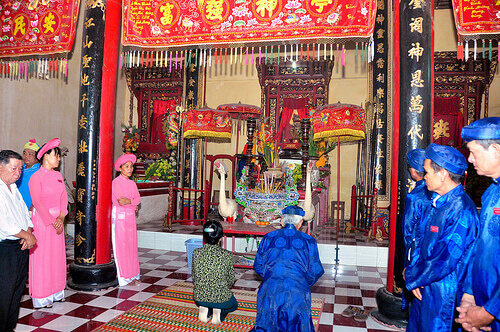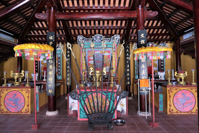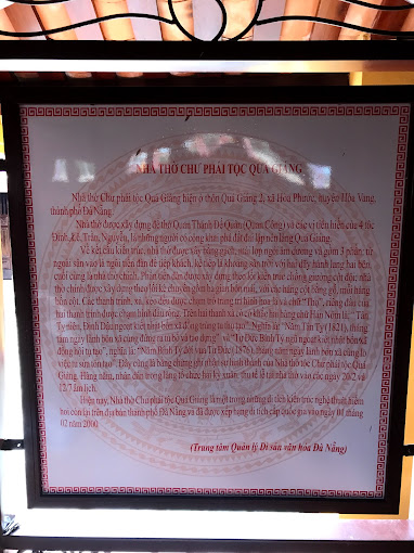 다낭시 호아방현 호아푸억 면, 콰장 마을에 있는 콰장 일족 교회. 이 교회는 Quan Thanh과 Dinh, Le, Tran, Nguyen 네 씨족의 전임자들을 숭배하기 위해 지어졌습니다. 그들은 Nguyen 경을 따라 남쪽으로 땅을 탐험하고 Qua Giang 마을을 세우는 공로를 쌓았습니다. 이전에는 여러 종파의 교회가 대나무로 지어졌습니다. 탄티(1821)년에 고관들과 공동체의 사람들이 함께 돈과 노력을 기부하여 오늘날의 교회를 재건했습니다. 수많은 복원과 장식을 거쳐 현재 까장씨 교회는 약 4,000평방미터의 부지에 자리잡고 있습니다. 교회 앞에는 높이 2.6m, 폭 2.8m의 스크린이 설치돼 있다. 화면 앞면에는 용 이미지가 양각으로 새겨져 있고 뒷면에는 춤추는 봉황 이미지가 있으며 도자기로 만들어졌습니다. 스크린 양쪽에는 높이 5m, 지름 0.5m의 원형 기둥 2개가 있어 웅장한 교회의 모습을 연출한다. 교회는 5cm x 20cm x 30cm 크기의 고대 벽돌을 모래 석회와 나뭇잎에 적신 당밀로 접착하여 지어졌습니다. 지붕은 두께 20cm의 음양기와로 덮었으며, 지붕 위에는 봉황이 어우러지는 모습이 그려져 있다. 양쪽에는 두 마리의 용이 서로를 바라보고 있습니다. 현관문 앞 현관 지붕에는 양쪽에 유니콘 두 마리의 모습이 그려져 있습니다. 교회는 전통적인 건축 양식으로 지어졌으며 전면 홀, 본당, 양쪽에 2개의 복도 등 3부분으로 구성되어 있습니다. 전면 홀과 메인 홀을 연결하는 것은 5x6m 너비의 마당과 양쪽에 두 줄의 지붕이 있는 복도로 문자 "Khau" 모양의 건축 계획을 형성합니다. 거리의 앞부분은 가로 12m x 세로 4m 크기로 '가짜손기둥' 형식으로 구성되었으며, 가짜손의 다리는 호박 모양으로 장식하고, 윗부분은 연꽃 모양으로 장식했다. 기둥의 두 주요 행에는 각각 5m 높이의 4개의 기둥이 있어 2개의 트러스를 지지하고, 기둥의 하단 2열은 2개의 보조 지붕을 지지합니다. 들보와 서까래는 식물, 꽃, 동물, 귀중한 그릇 및 기타 장식 선으로 장식되어 있습니다. 서까래 꼬리에는 잉어가 용으로 변하는 모습이 새겨져 있다. 본당은 3개의 칸과 4개의 지붕을 갖춘 3칸 구조로 지어졌으며, 아래로 약 0.5m 아래에는 전면에 현관이 있는 측면 날개 2개가 있습니다. 4줄의 큰 기둥, 각 줄은 직경 30cm, 높이 3~5m의 4개 기둥이 4개의 주요 지붕을 지지합니다. 높이가 약 2.5m인 두 개의 작은 기둥 열과 두 개의 보조 날개의 지붕을 지지하는 주 기둥 열이 있습니다. 현관은 지지 기둥의 주 행에 연결된 6개의 2.5m 높이 기둥으로 구성됩니다. 막대, 들보, 서까래, 서까래에는 모두 꽃과 잎, "tho"라는 단어와 아름다운 장식 패턴이 새겨 져 있습니다. 두 막대의 끝 부분에는 용의 머리 모양이 새겨져 있습니다. 두 개의 대나무 들보(겨울 들보와 여름 들보)에는 "뱀띠, 닭띠, 닭띠, 닭띠, 기띠년"이라는 두 줄의 한자가 새겨져 있습니다. 뱀, 닭의 해, 뱀의 해, 뱀의 해, 닭의 해의 상서로운 날." 코뮌은 함께 수리하고 창조합니다."; 그리고 "Tu Duc Binh Ty의 해, 쥐의 해, 쥐의 해, Tu Duc 왕의 통치(1876), 그 해, 마을의 상서로운 날, 공동체가 함께 합니다. 수리 및 장식 관리". 본당 중앙에는 꽌탄(Quan Thanh)을 모시는 제단이 있습니다. 왼쪽 정자는 Dinh-Le 씨족의 두 조상을 모시고, 오른쪽 정자는 Tran-Nguyen 씨족의 두 조상을 모신다. 오른쪽 날개에는 지신을 숭배하는 데 사용되는 작은 제단이 있습니다. 이 제단은 나중에야 세워졌습니다. 본당에는 3개의 대문과 2개의 옆문이 있으며, 문은 꽃과 잎을 조각한 나무로 만들어졌으며, 시 가방, 술주머니... 지붕은 "달 옆에 있는 두 마리의 용"의 이미지로 장식되어 있습니다. 상하문 세트와 문눈 세트는 유명한 김봉 마을 장인의 숙련된 손길로 호이안의 건축 양식을 명확하게 보여줍니다. 본관의 두 측면 날개 옆에는 본관과 전면 제단을 연결하는 지붕이 있는 두 개의 복도가 있습니다. 각 복도에는 2.5m 높이의 기둥 두 줄로 지지되는 두 개의 지붕이 있습니다. 기둥은 수평 막대로 서로 연결됩니다. 이 수평 막대에서 기둥이 올라가 트러스를 지지합니다. 까장(Qua Giang) 가문의 교회는 19세기 초에 건축되었으며, 오랜 역사적 가치와 건축적, 예술적 가치를 모두 갖고 있습니다. 이것은 다낭시에 남아 있는 희귀한 고대 건축 및 예술 유물 중 하나입니다. 매년 음력 2월 20일과 7월 12일에 마을 사람들은 이 땅을 개척한 조상들을 기념하기 위해 두 차례의 춘추행사를 거행합니다. 이러한 전형적인 가치를 지닌 까장씨 교회는 2000년 2월 1일 문화정보부(현 문화체육관광부)로부터 국가기념물로 지정되었습니다. 출처 : 문화재청
