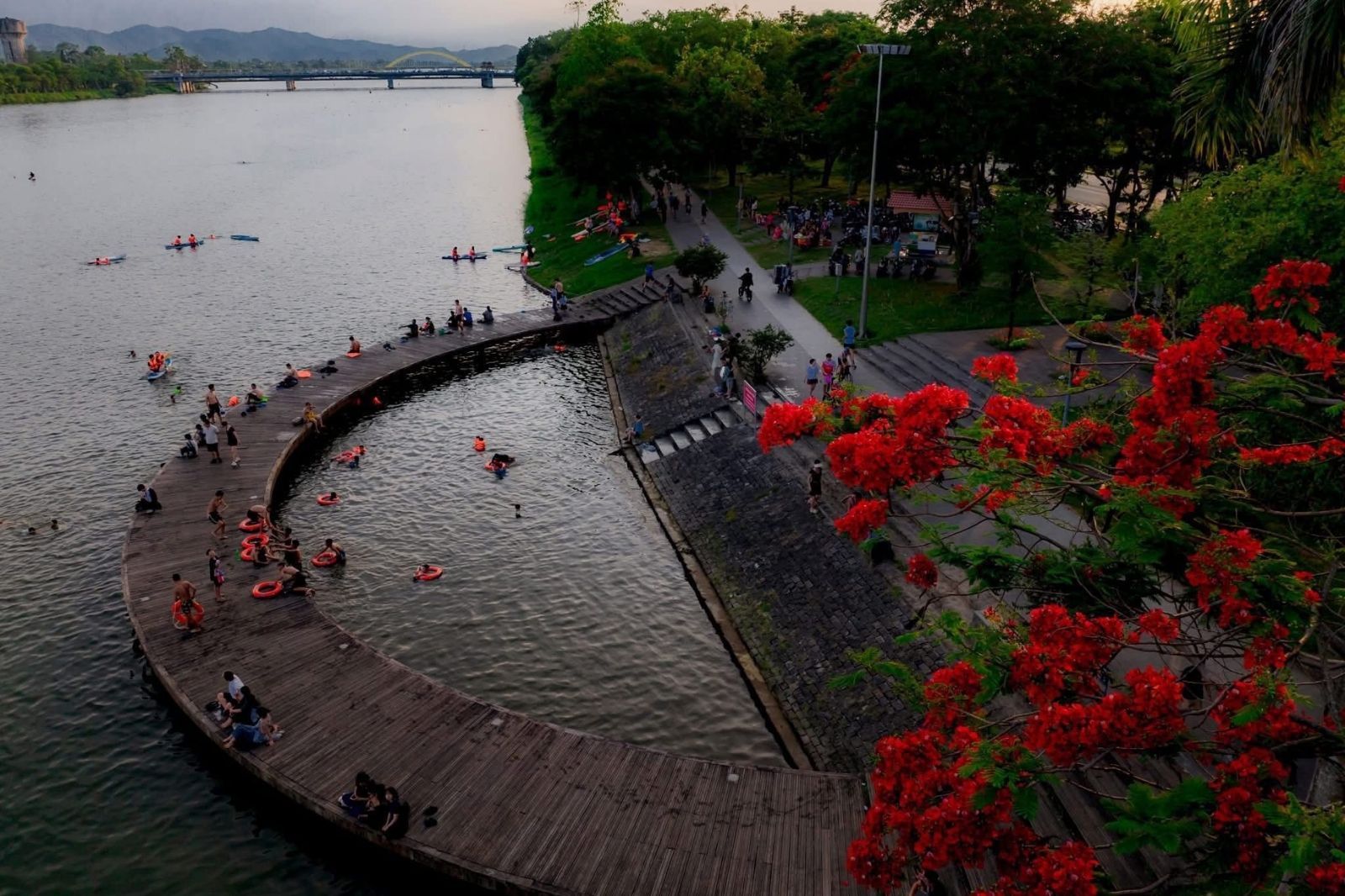 Cầu Bán Nguyệt nhanh chóng trở thành điểm đến thu hút đông đảo du khách và các bạn trẻ địa phương đến vui chơi. Nơi đây sở hữu không gian thoáng đãng cùng tầm nhìn tuyệt đẹp hướng ra dòng sông Hương hiền hòa. Nếu bạn đang tìm kiếm một góc sống ảo mới mẻ hay đơn giản là nơi để thư giãn tâm hồn thì đây chính là lựa chọn hoàn hảo.