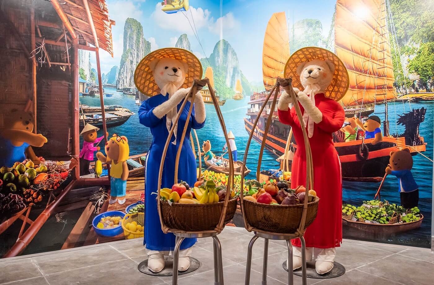 Đặc biệt,bảo tàng Gấu Teddy Phú Quốc còn có một khu vực triển lãm riêng về văn hóa và lịch sử Việt Nam. Tại đây,bạn sẽ thấy những tái hiện về cung đình Huế,cảnh đội tuyển bóng đá Việt Nam nâng cúp chiến thắng,và những hình ảnh về chợ nổi đặc trưng của miền Nam. Khu vực này mang đến cho du khách một cái nhìn thú vị và độc đáo về đất nước và con người Việt Nam qua hình ảnh các chú gấu bông.