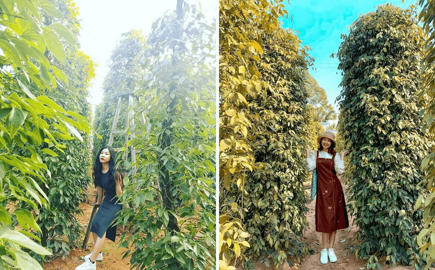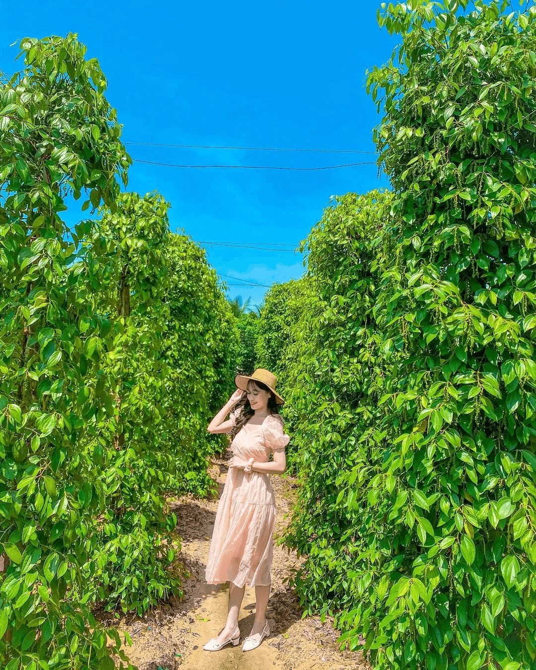 Không chỉ là nơi sản xuất tiêu,các vườn tiêu Phú Quốc còn là điểm đến lý tưởng để chụp ảnh check-in. Những lối nhỏ dài như mê cung,xen lẫn giữa những hàng tiêu xanh mướt tạo nên một khung cảnh độc đáo. Đặc biệt,màu đỏ của các chùm tiêu chín trên nền xanh của lá cây là điểm nhấn tuyệt đẹp cho những bức ảnh sống động. Hít thở hương thơm cay nồng từ vườn tiêu còn là liệu pháp tự nhiên tuyệt vời cho những ai mắc bệnh xoang.