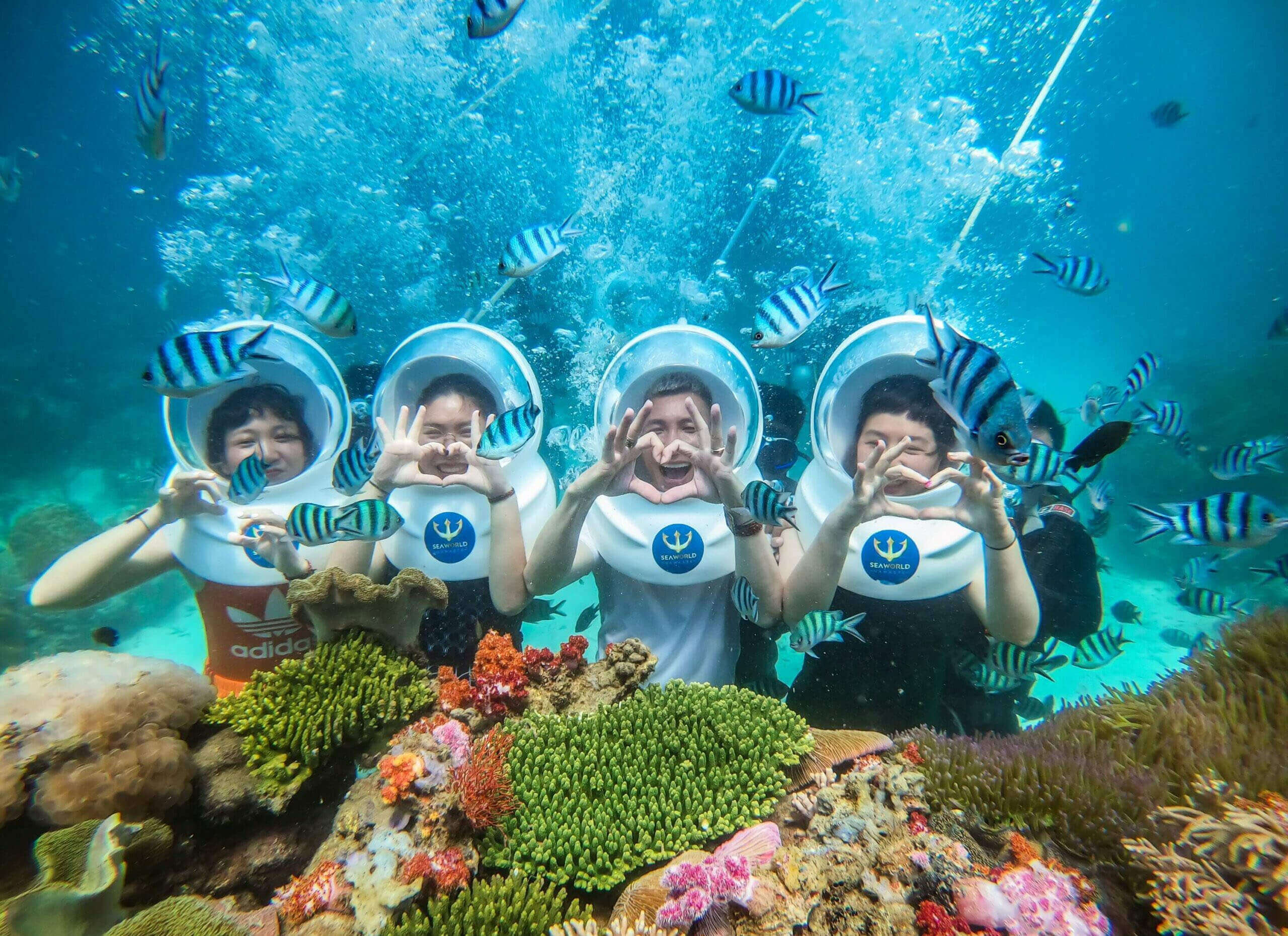 Đi bộ dưới biển (Sea Walker): Đây là một hình thức lặn biển mới lạ và độc đáo tại Phú Quốc. Du khách sẽ được trang bị mũ điều hòa khí lặn,giúp cho việc thở và quan sát dưới nước dễ dàng hơn bao giờ hết. Trải nghiệm này phù hợp với cả những du khách không biết bơi,mang đến cơ hội chiêm ngưỡng rạn san hô và đàn cá màu sắc phong phú ngay gần mặt nước.