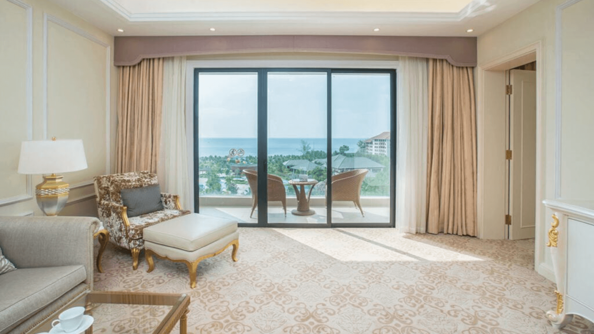The 84m2 Junior Suite Room is equipped with the same amenities as the Standard Room but has a double bed and a larger area. And of course,this room cannot lack a valuable sea view balcony. The luxurious,elegant and sophisticated Neoclassical interior style is the perfect resort space.