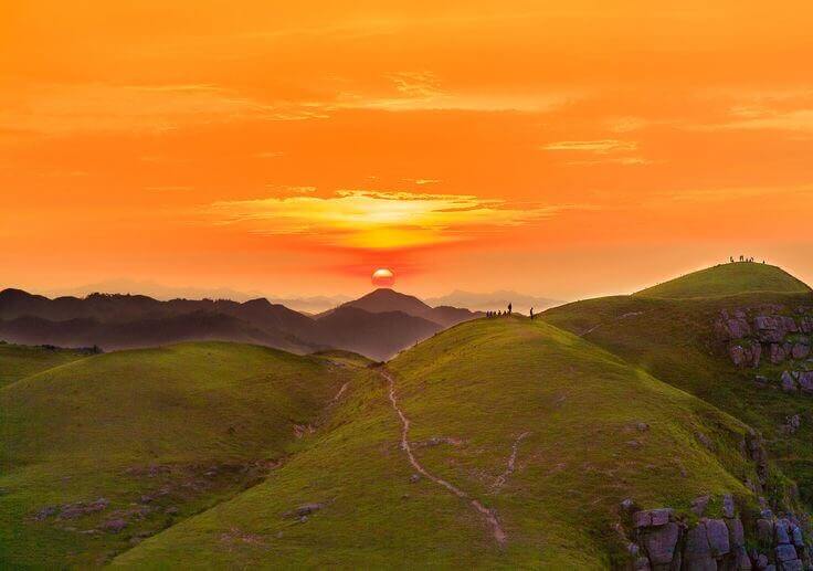 Đồng Cao nổi tiếng với cảnh đẹp thiên nhiên hùng vĩ,những đồi cỏ xanh mướt và khung cảnh hữu tình. Du khách không thể bỏ qua cảnh đẹp lãng mạn của mặt trời mọc và lặn trên đồi cỏ. Nằm chờ đợi trên bãu cỏ mềm mại,đặt thêm một cốc cacao hoặc cafe ấm bên cạnh,thưởng thức chúng cùng với khung cảnh bầu trời chuyển sang ánh cam đỏ rực rỡ,một khung cảnh chói lọi như mở ra cánh cổng của một thế giới khác rất tuyệt vời. Được bao quanh bởi bầu trời màu đỏ cam cùng cơn gió dịu dàng,tâm hồn như phơi phới,rất thư giãn và dịu êm. Nhớ là tháo dép để cảm nhận thêm sự êm ái từ bãi cỏ,đây sẽ trở thành những giây phút yên bình nhất của bạn.