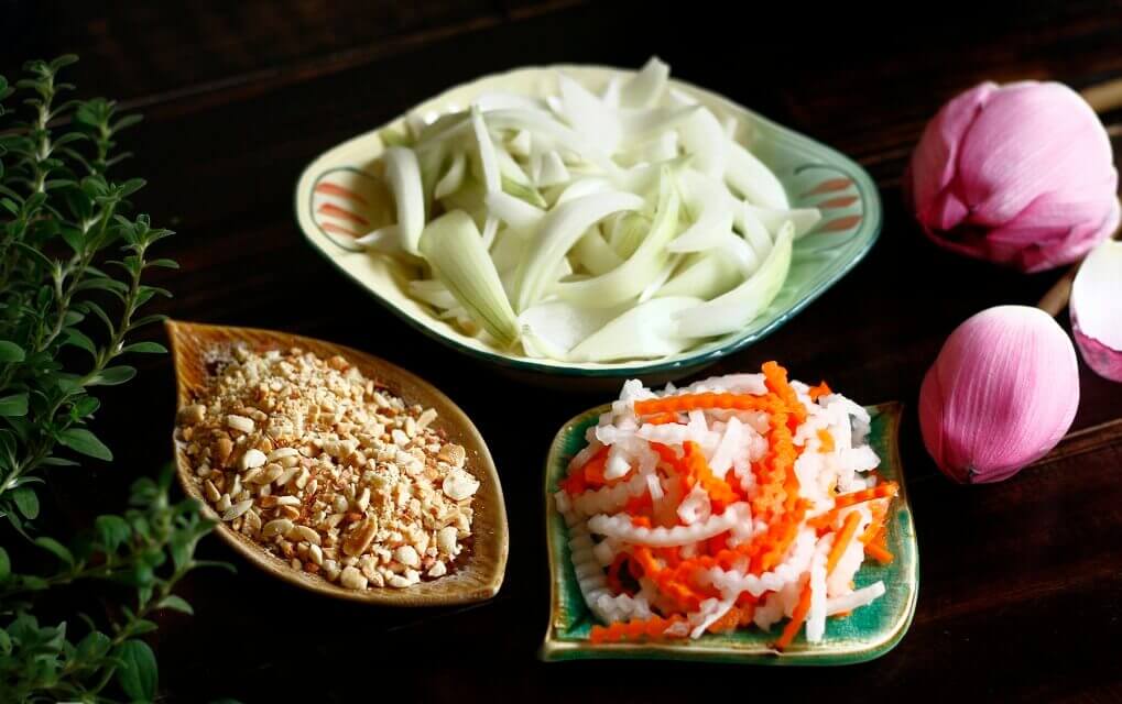 Hành tây thái múi cau. Đậu phộng rang vàng thơm,giã dập. Đồ chua giúp tăng thêm hương vị và kích thích vị giác cho nhiều món ăn Nam Bộ nói chung và miền Tây nói riêng. Cách làm đồ chua: Món này nên làm sẵn,để dùng quanh năm. Cách làm: Cà rốt,củ cải rửa sạch,bào bỏ vỏ rồi cắt sợi vừa ăn rồi cho vào âu,thêm chút muối bóp nhẹ rồi để 15 - 20 phút cho ra nước. Quy tắc ''muối tách,đường giữ'' trong ẩm thực giúp nước bên trong tiết ra,làm cho củ quả giòn hơn,muối cũng giúp việc bảo quản được lâu. Sau đó,vớt ra rửa sạch để giảm vị mặn và bớt mùi hăng. Dùng khăn xô sữa hoặc túi lưới,cho củ cải,cà rốt vào bóp bỏ nước giúp cho đồ chua được giòn ngon. Sau đó,cho củ cải và cà rốt ra âu rồi đổ ngập phần hỗn hợp nước đường,giấm tỷ lệ 2:1,thêm chút muối vào,để sau 3 giờ là có thể dùng được.