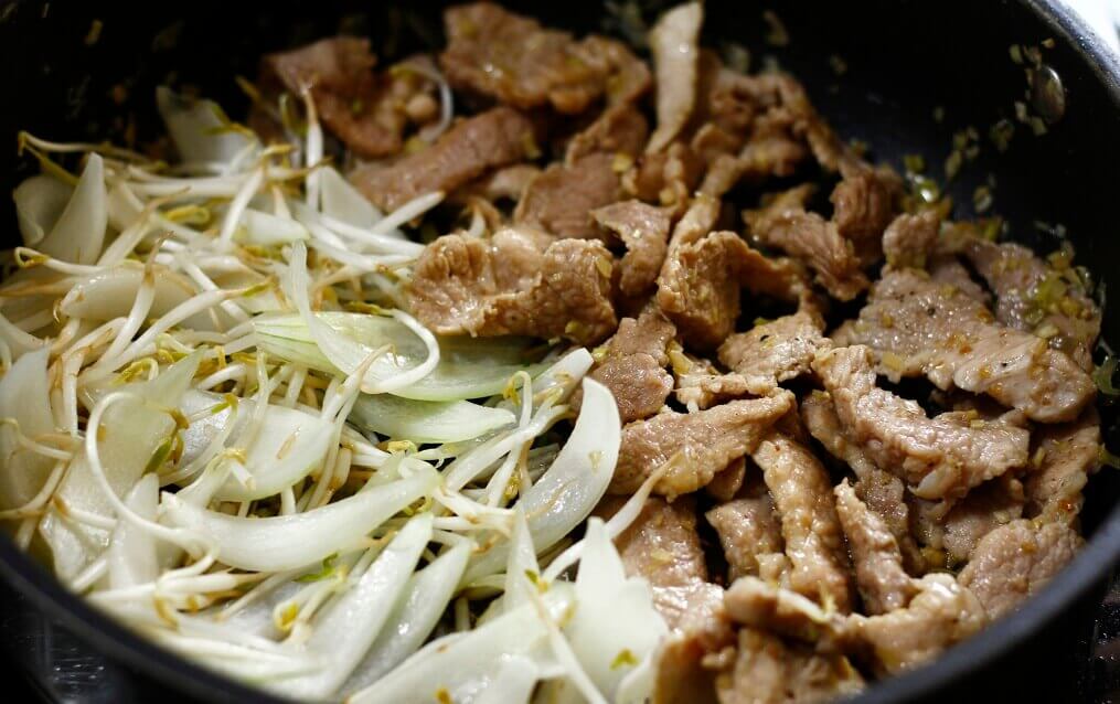 Món này ăn nóng nên người miền Tây thường xào theo mỗi suất ăn. Phi thơm tỏi,sả,hành rồi cho phần thịt lợn đã ướp vào xào cho săn lại. Khi thịt chín cho hành tây vào đảo,tiếp đến cho giá vào đảo nhanh tay cho chín tới là được.