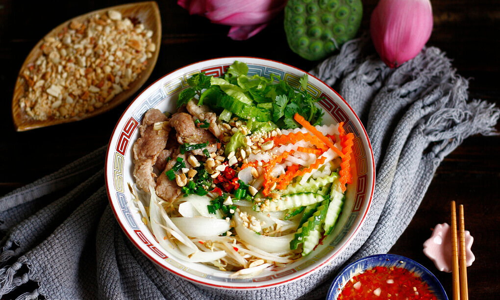 Trụng bún chia đều vào các tô,cho rau thơm,rau sống,đồ chua,dưa leo,múc thịt xào cùng hành tây,giá đỗ vào. Trên cùng rắc đậu phộng rang giã dập,thêm mỡ hành rồi rưới nước mắm chua ngọt thưởng thức. Cách pha nước mắm chua ngọt: cho mắm ngon (30 - 45 độ đạm),giấm,đường,nước lọc vào bát tỷ lệ 1:1:1:5 rồi khuấy cho tan đường,cuối cùng thêm tỏi ớt băm nhỏ lên,tùy theo khẩu vị mà điều chỉnh cho vừa miệng.
