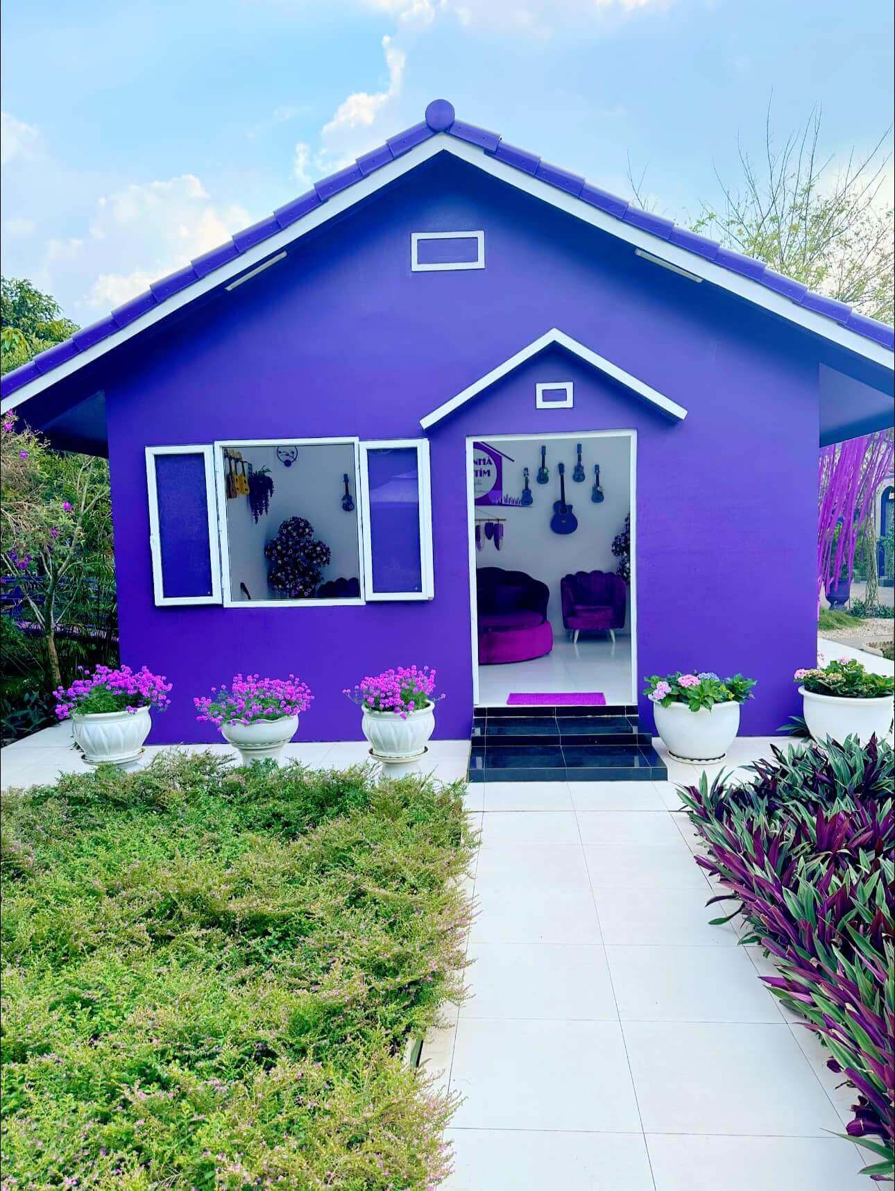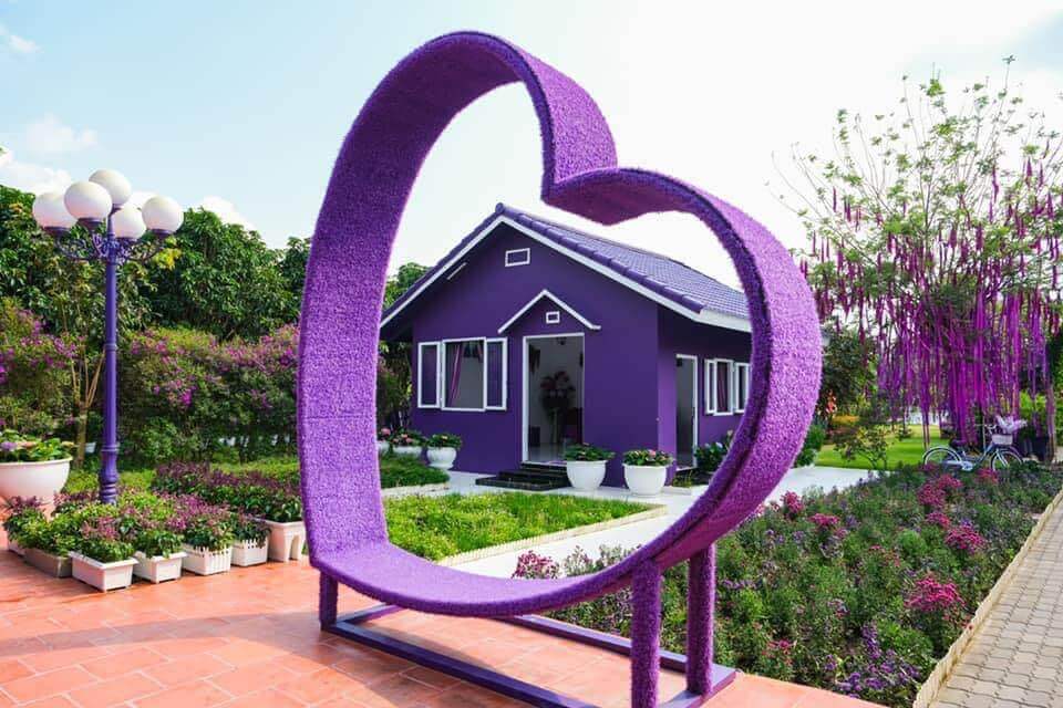 Khi bước chân vào khuôn viên rộng 5.000m2 của căn nhà màu tím,tôi lập tức bị cuốn hút bởi màu sắc chủ đạo bao trùm khắp nơi. Đúng như tên gọi,tất cả mọi thứ từ căn nhà,chi tiết trang trí đến chiếc xe đạp,xích đu,ghế ngồi… đều tràn ngập sắc tím. Các gam màu tím nhạt,tím sen,tím đậm hoà quyện với nhau tạo nên một khung cảnh lãng mạn,thơ mộng,và đôi khi có chút hoài cổ.