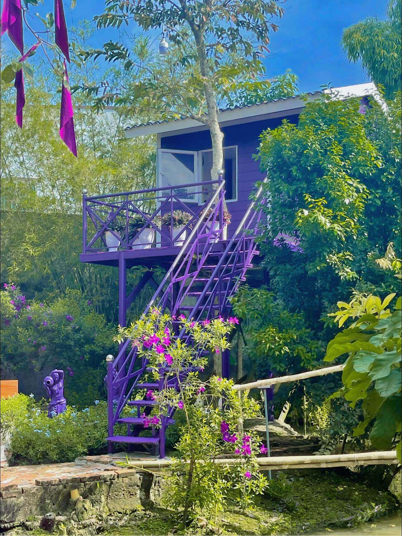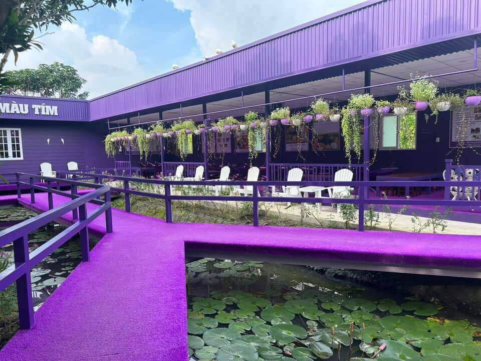 Khung cảnh nơi đây không chỉ đẹp mắt mà còn mang đậm chất văn hoá Tây Nam Bộ. Tôi cảm nhận được sự mát mẻ và dễ chịu từ không khí trong lành của cây cối xung quanh. Những thiết kế phong cách Việt Nam thời xưa,đặc biệt là những chi tiết đặc trưng của miền Tây sông nước,đã tái hiện một cách chân thực và sinh động. Những bậc thang màu tím,dàn hoa tím và ngôi nhà tím nhỏ xinh xắn đều gợi lên một cảm giác yên bình và lãng mạn.