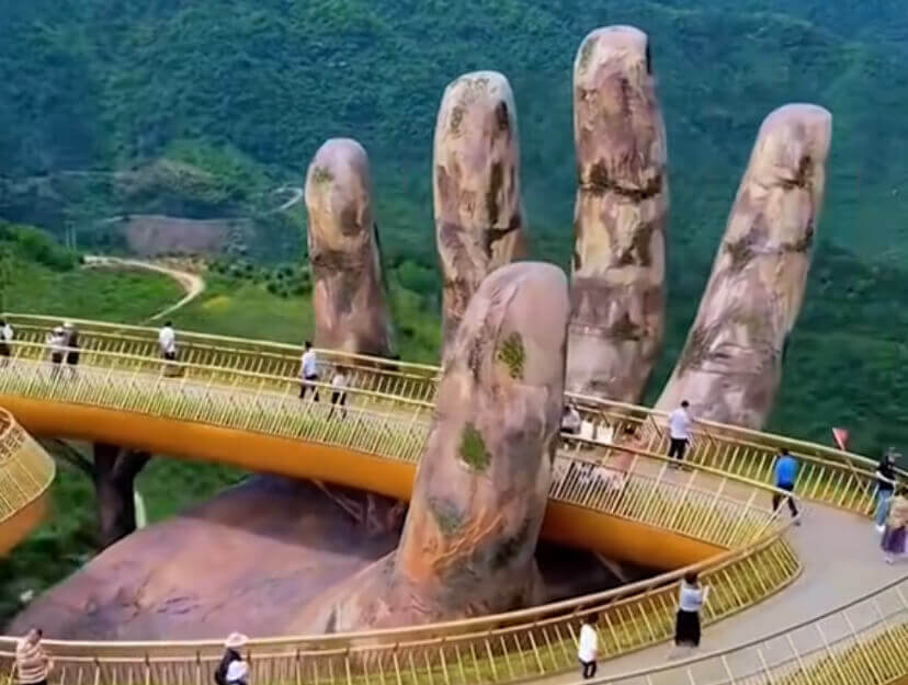 Cầu Vàng với sự nâng đỡ của những bàn tay khổng lồ đang được chia sẻ một cách chóng mặt trên những trang mạng xã hội, các cộng đồng du lịch, khiến nhiều người không khỏi ngỡ ngàng. Cầu Vàng (Golden Bridge), một công trình mới của Sun World Bà Nà Hills. Được khởi công xây dựng vào 07/2017 tới 04/2018 thì hoàn thành, thời gian gần đây đã đi vào hoạt động và đón những lượt khách tham quan du lịch Đà Nẵng đầu tiên. Sở hữu thiết kế vô cùng độc đáo và mới lạ, chưa từng có ở Việt Nam, cây câu được xây dựng tại độ cao hơn 1.400 mét so với mực nước biển, tổng chiều dài vào khoảng 150 mét, với 8 nhịp cầu, nhịp lớn nhất là 21.2 mét. Mặt cầu được làm bằng gỗ kiềng rộng 3 mét, dày 5 cm, dọc hai bên lối đi được trồng rất nhiều hoa Nữ hoàng Xanh, bên trên là phần lan can được làm bằng inox mạ vàng. Có thể thấy cây cầu này được thiết kế và tạo hình giống với hình tượng một người phụ nữ đang dùng đôi bàn tay của mình để nâng đỡ một dải lụa vàng vắt ngang. Với hình ảnh độc đáo, cầu vàng ở Bà Nà Hills đã khiến không ít người phải ngỡ ngàng và nể phục sự sáng tạo của những người thiết kế và xây dựng công trình này. Không chỉ được chiêm ngưỡng vẻ đẹp của công trình độc đáo này, tới đây bạn sẽ được thỏa sức ngắm nhìn cảnh đẹp hùng vĩ đầy ngoạn mục của núi rừng xung quanh. Cảm giác đi dạo trên những tầng mây lơ lừng, ngắm nhìn cảnh đẹp bên dưới sẽ là trải nghiệm vô cùng tuyệt vời đối với nhiều du khách. Rất nhiều những tấm hình đẹp đã được du khách tới đây chụp lại, nhiều người xem cứ ngỡ đây là một địa điểm du lịch nào đó của nước ngoài. Nhưng khi biết đó là cầu Vàng trên đỉnh Bà Nà mọi người vô cùng ngạc nhiên và thích thú muốn tìm đến ngay để chiêm ngưỡng cảnh đẹp này. Có thể thấy Đà Nẵng không chỉ sở hữu những cảnh quan thiên nhiên kỳ thú mà những công trình được xây dựng từ chính khối óc và bàn tay con người cũng được thể hiện tại thành phố này một cách vô cùng độc đáo, trong đó không thể không nhắc tới cầu Vàng ở Đà Nẵng một công trình mang tính nghệ thuật cao.