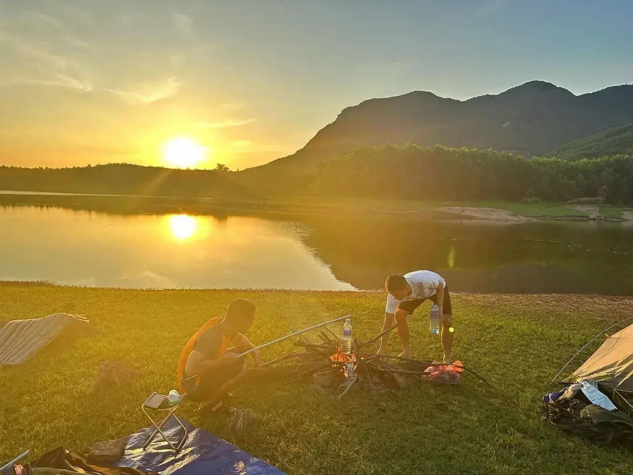 Early the next morning,dawn in Tra Ly began with the appearance of golden rays of sunlight. The sun rises from the mountain in front of our eyes,the image of the sun disappearing behind the mountain reflects on the water. A rustic and beautiful scene that nature has created for people to admire,but cannot be seen in urban areas or cities. Don't forget leftovers such as trash,firewood or charcoal burned last night,clean up to protect the environment as well as be aware of general hygiene.