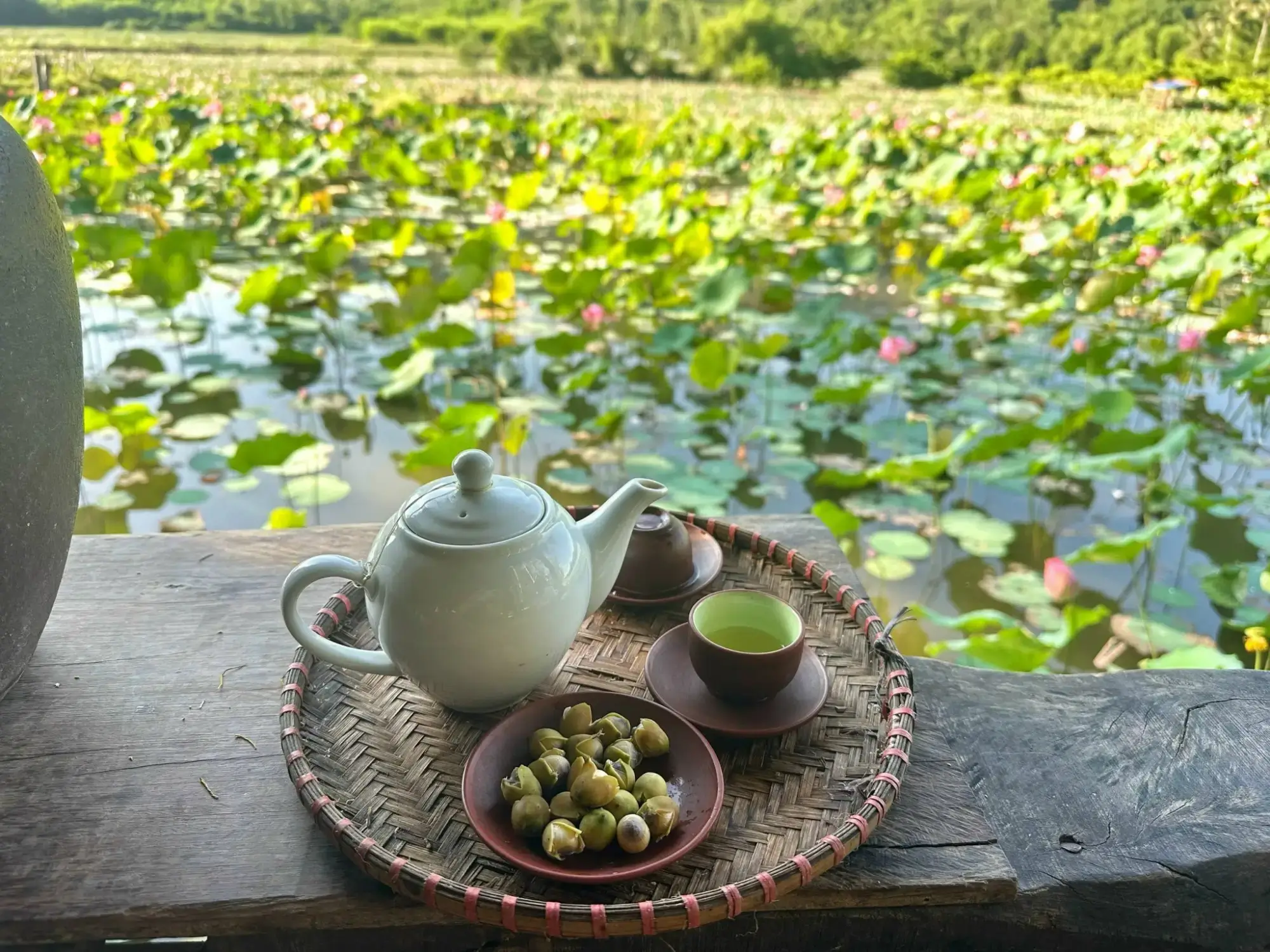 Next is a trip to the nearby lotus village,only about 1km from the dam. The sight of floating lotus flowers on the lake surface creates a very relaxing and tea ceremony space. An unforgettable photo location for women. Come to Uncle Hanh's lotus field and enjoy the lotus tea brewed by him,both fragrant and sweet. The moment I clicked my lips on the cup of tea,I thought I had enlightened and became more feminine and gentle. The lotus is in front of your eyes,the lotus scent is floating around,the lotus tea still has a light taste in your mouth,a strangely enjoyable feeling of being enveloped. Then remember to buy lotus heart tea to support him. Lotus tea,if drunk regularly,also has certain benefits for our body.