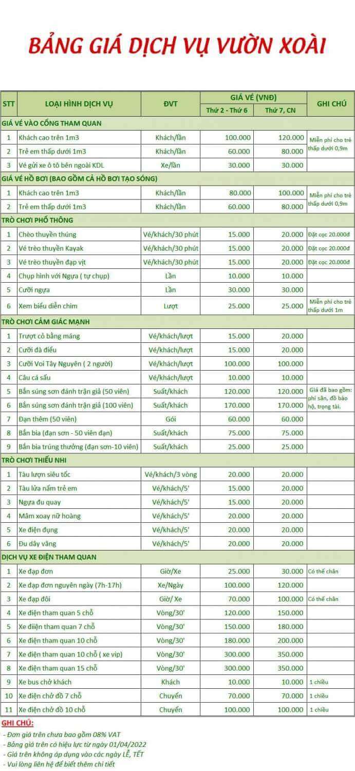 2. Tham khảo bảng giá vé các dịch vụ tại khu du lịch Vườn Xoài