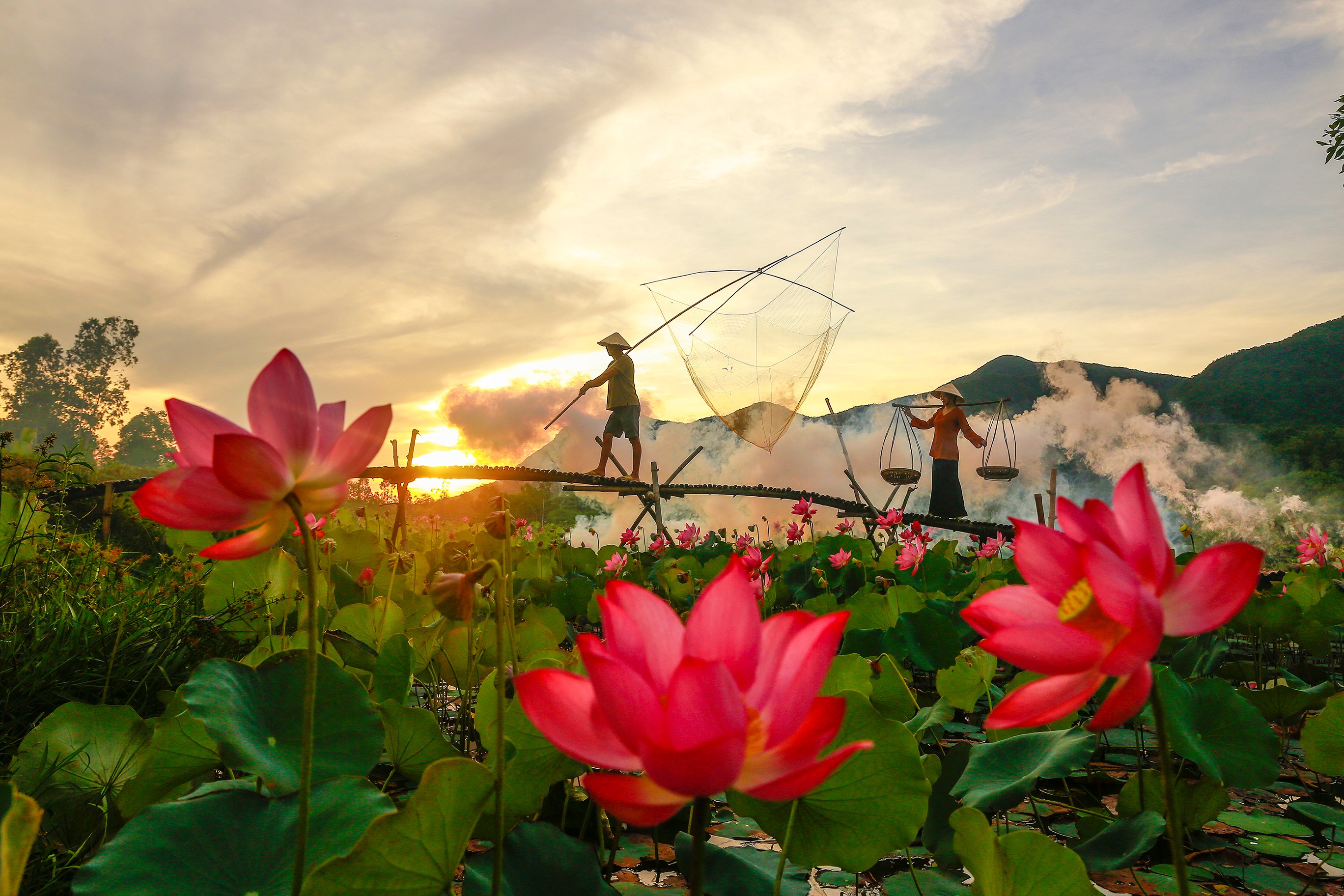 Điều đặc biệt là sen ở đây không chỉ mọc rải rác mà tạo thành từng đầm rộng mênh mông,nối nhau bất tận. Đứng từ xa nhìn lại,cả không gian như một tấm thảm khổng lồ trải dài,điểm tô bởi muôn ngàn đóa sen hồng nở rộ dưới nắng mai. Cảnh sắc ấy khiến bất kỳ ai đặt chân đến cũng phải chậm lại nhịp thở,để hồn mình chìm đắm trong sự thanh khiết của loài hoa biểu tượng.