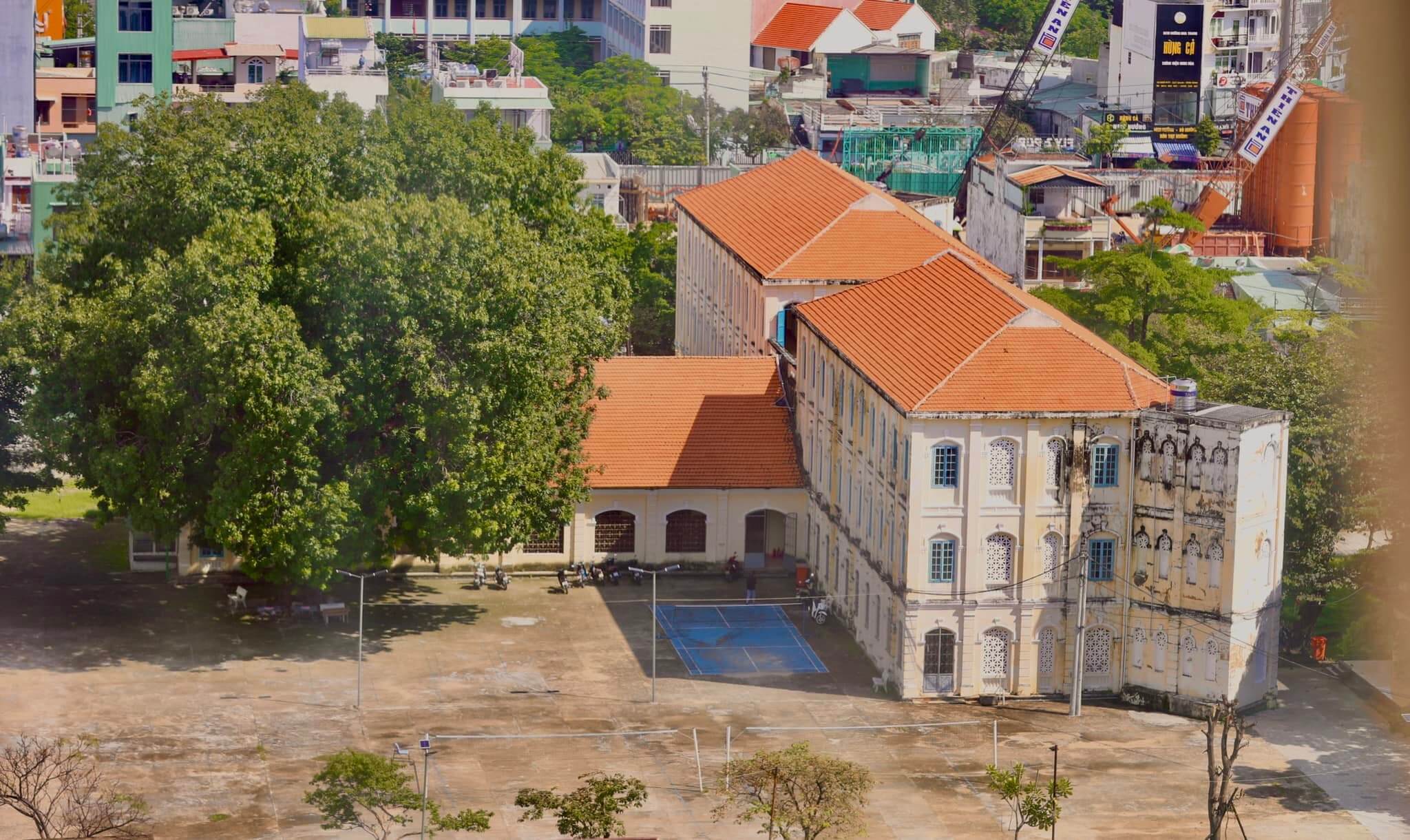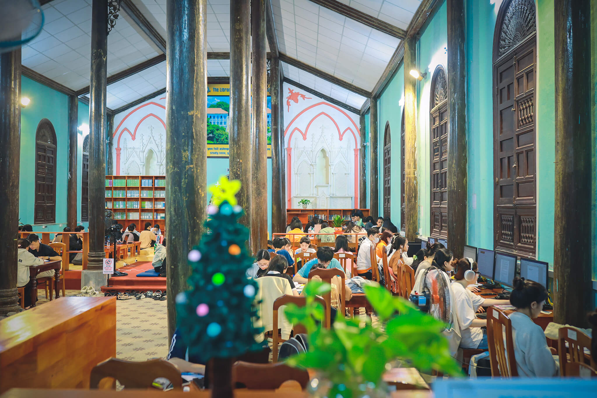 Điểm đến đầu tiên của tôi là thư viện trường,một công trình kiến trúc mang đậm dấu ấn thời gian. Theo lời giới thiệu,nơi đây từng là Đại chủng viện Quy Nhơn,được xây dựng từ những năm 1930. Vẻ đẹp trầm mặc,cổ kính của thư viện khiến tôi cảm thấy như đang bước vào một thước phim lịch sử. Những bức tường gạch nhuốm màu thời gian,những ô cửa sổ vòm cong duyên dáng,những dãy kệ sách cao ngút,tất cả tạo nên một không gian đầy hoài niệm.