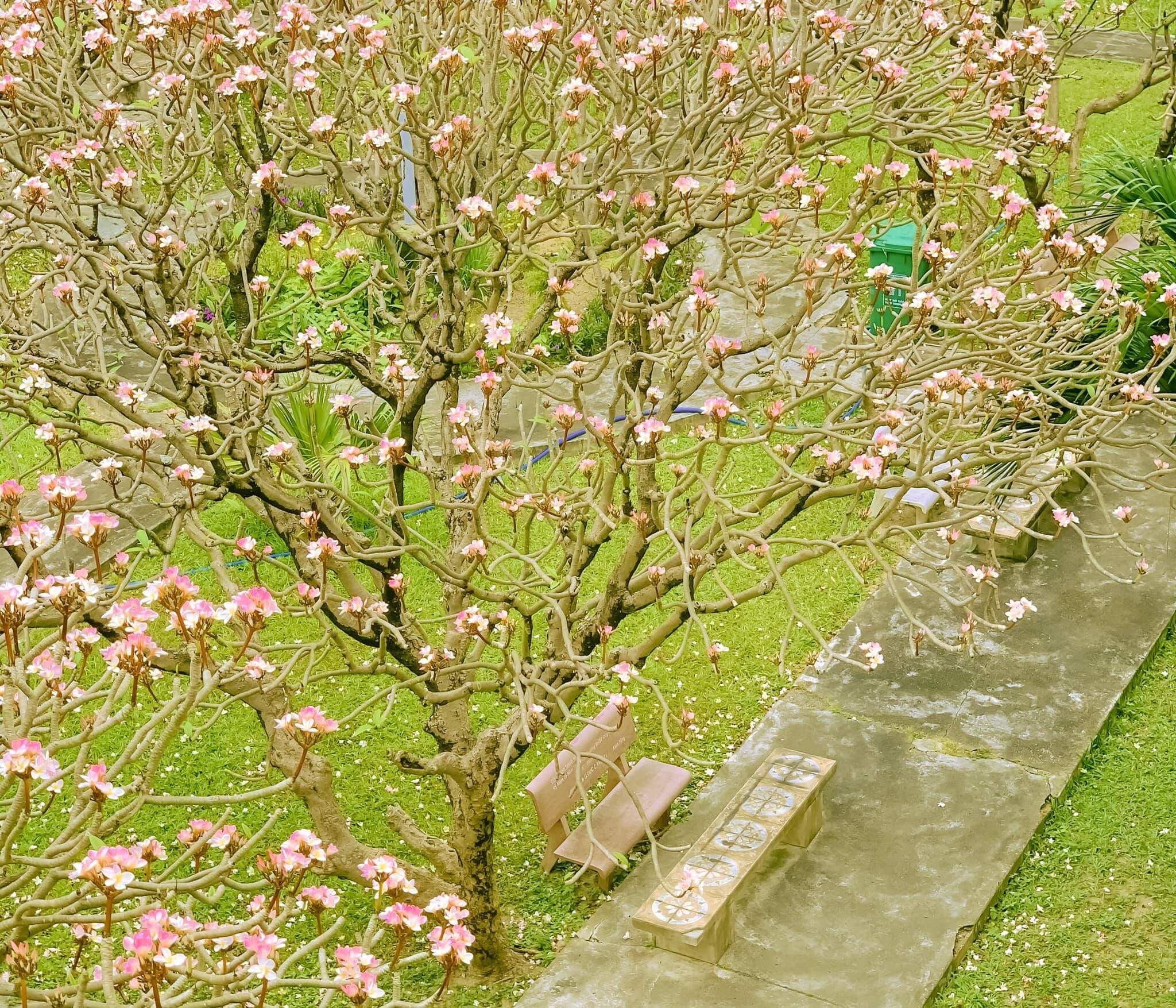 Rời thư viện,tôi tiếp tục hành trình khám phá khuôn viên trường. Điểm dừng chân tiếp theo của tôi là khuôn viên hoa sứ A7,nơi được mệnh danh là "góc check-in thần thánh" của sinh viên Đại học Quy Nhơn. Những cây hoa sứ xinh đẹp,tạo nên một khung cảnh lãng mạn,nên thơ. Tôi không bỏ lỡ cơ hội ghi lại những khoảnh khắc đẹp đẽ tại đây,lưu giữ kỷ niệm về chuyến đi đáng nhớ.