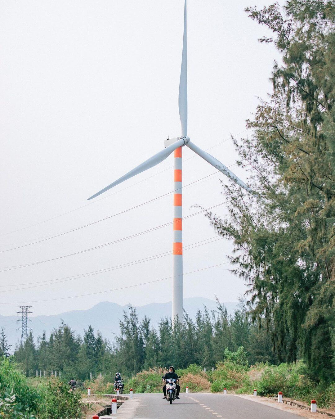 Cánh đồng điện gió Phương Mai trải dài mênh mông với những tua-bin gió khổng lồ đứng hiên ngang giữa trời. Cảm giác đầu tiên của mình là sự choáng ngợp trước quy mô và vẻ đẹp hiện đại của công trình này. Mình dừng xe,bước xuống và bắt đầu khám phá.