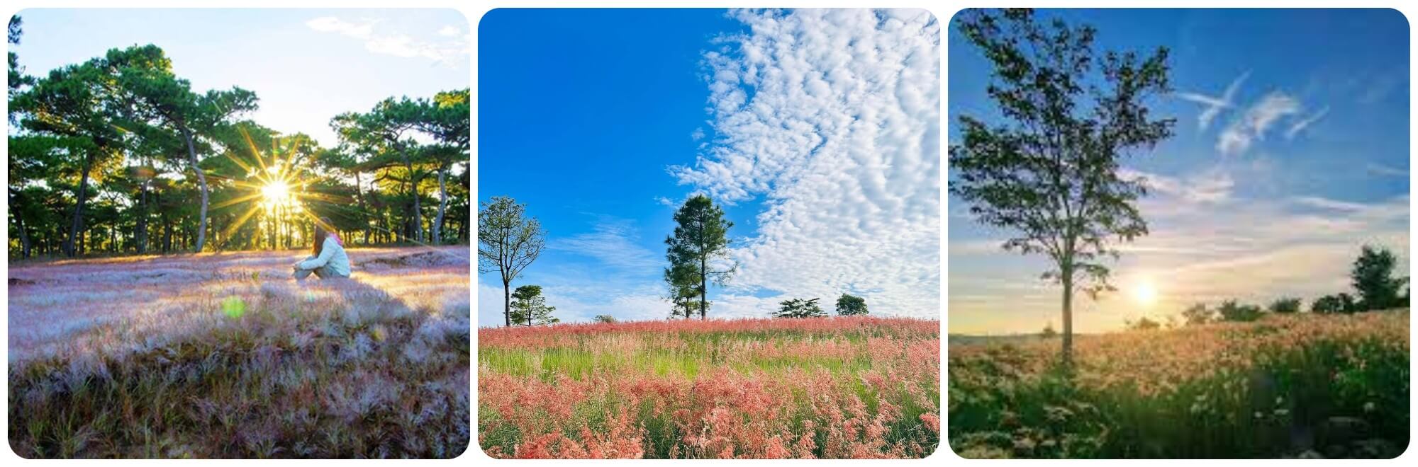 Khi đến nơi tôi dường như không thể nào rời mắt khỏi bức tranh thiên nhiên tuyệt đẹp trước mắt. Đồi cỏ hồng thực sự làm tôi ngỡ ngàng,ở đây mang một vẻ đẹp tự nhiên và hiếm có. Màu hồng phấn của những ngọn cỏ trải dài trên cả một khu đồi,hòa quyện với nền xanh của rừng thông cùng bầu trời trong xanh. Và loại cỏ ở đây cũng đặc biệt không kém,trông rất khác với những loại cỏ tôi từng thấy,chúng có thân cao,thẳng đứng,mọc san sát nhau tạo thành từng cụm cùng với những bông nhỏ li ti có màu hồng ánh tím,rất mềm mại và mỏng manh. Ánh nắng sớm chiếu xuống những sắc vàng dịu nhẹ khiến toàn bộ khu vực đồi cỏ dường như bừng sáng lên đầy quyến rũ.