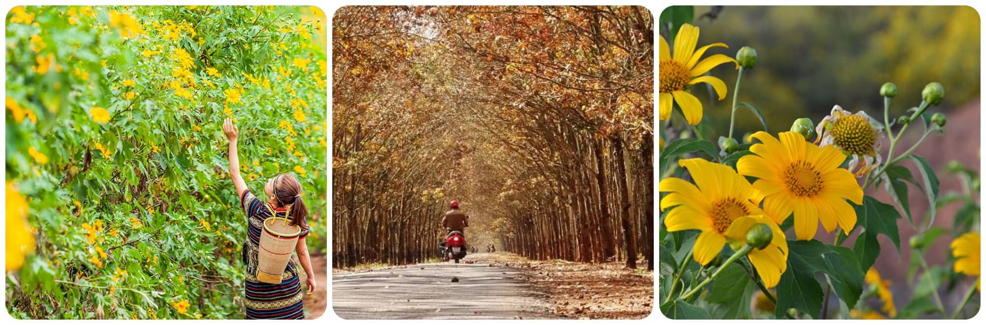 Khi đông về,Gia Lai chìm trong màn sương mờ ảo,mang vẻ đẹp trầm mặc và lãng mạn. Những rừng cao su thay lá,từng chiếc lá vàng đỏ nhẹ rơi,phủ kín các con đường,tạo nên khung cảnh như trong một bức tranh sơn dầu. khắp các sườn đồi,sắc vàng rực rỡ của hoa dã quỳ như càng làm cho vẻ đẹp của Gia lai vào mùa này trở nên cuốn hút hơn bao giờ hết.