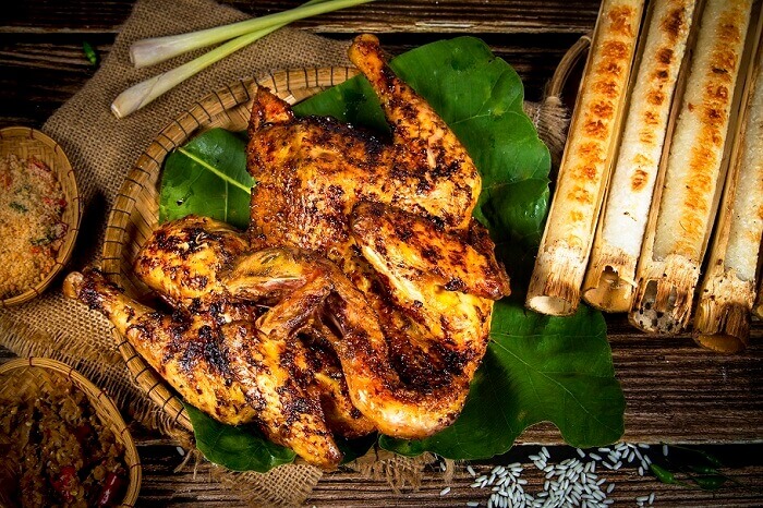 - Cơm lam gà nướng: Món ăn này mang hương thơm đặc trưng của cơm lam,vị ngọt của mật ong thấm đều vào từng miếng thịt gà. Vị cay của ớt kích thích vị giác và khiến thực khách thưởng thức mãi mà không chán.