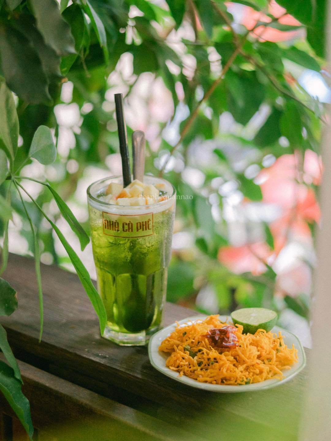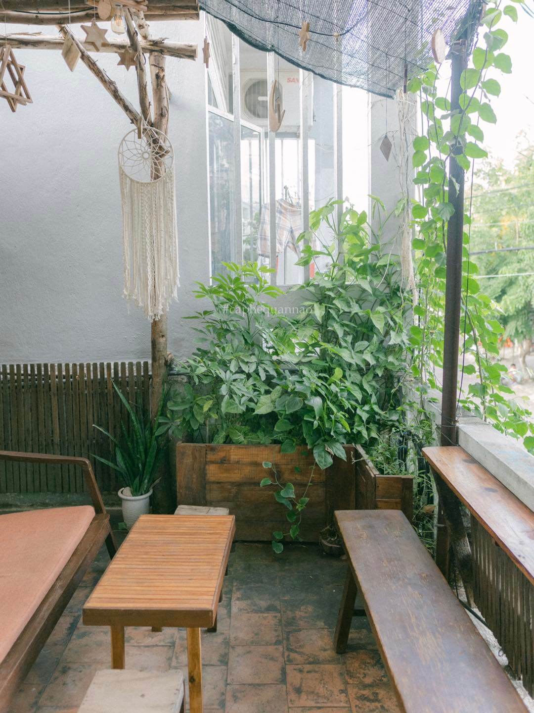 Cánh cửa gỗ cũ kỹ khẽ mở ra,như một lời mời gọi bước vào thế giới của những hoài niệm. Bước qua ngưỡng cửa,tôi như lạc vào một khu vườn bí mật,tách biệt hoàn toàn với những ồn ào,náo nhiệt của phố thị. Không gian xanh mướt tràn ngập,từng chậu cây,giàn hoa được chăm chút tỉ mỉ,như muốn ôm trọn lấy những vị khách đang tìm kiếm sự an yên. Ánh nắng vàng len lỏi qua từng tán lá,rọi xuống những bộ bàn ghế gỗ mộc mạc,phủ lên không gian một lớp bụi vàng dịu dàng,ấm áp.
