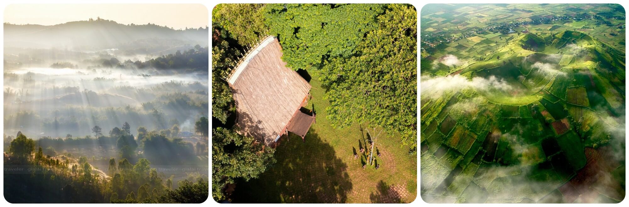 Từ trên cao,bạn sẽ thấy những mái nhà sàn nhỏ bé nằm giữa các thung lũng. Khói bếp bay lên,len lỏi qua các tán cây,mang đến cảm giác bình yên và thân thuộc. Những con đường đất nhỏ nối liền các bản làng như mạch máu của núi rừng,nơi mà cuộc sống của người dân gắn bó mật thiết với thiên nhiên. Những cánh đồng ruộng bậc thang trải dài theo triền núi là minh chứng cho sự cần cù,sáng tạo của người dân nơi đây. Xen lẫn giữa màu xanh của rừng là màu vàng của lúa chín tạo nên một bức tranh đầy màu sắc. Những vườn cà phê,cao su,tiêu xanh mướt cũng là một phần không thể thiếu trong cảnh sắc Gia Lai. Tất cả đều hòa quyện,tạo nên một bức tranh sinh động nhưng vẫn giữ được vẻ hoang sơ vốn có.