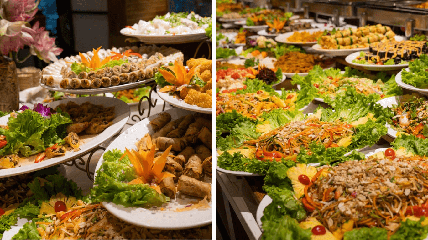Thực đơn của Buffet Chay Hương Thiền rất phong phú với hơn 50 món ăn,bao gồm các món khai vị,súp,cơm,bún và các món tráng miệng hấp dẫn. Tất cả các món ăn đều được chế biến từ nguyên liệu tươi ngon,đảm bảo an toàn vệ sinh thực phẩm,giúp bạn thưởng thức bữa ăn một cách an tâm. Đặc biệt,các món ăn tại đây đều hoàn toàn chay,không sử dụng gia vị hay phụ gia hóa học,phù hợp cho những ai muốn ăn uống lành mạnh.