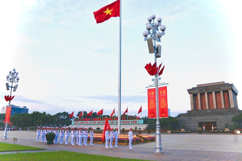 Mở đầu một ngày mới hoà vào nhịp sống chập rãi của thủ đô,bạn hãy đến dự lễ thượng cờ tại lăng Bác lúc 6 giờ sáng. Không khí trang nghiêm,mát lành tại nơi đây sẽ cho bạn một cảm giác vô cùng khó tả,đặc biệt là khi đứng trước lăng Hồ chủ tịch nhìn ngắm lá cờ đỏ Việt Nam dược giương lên cao.