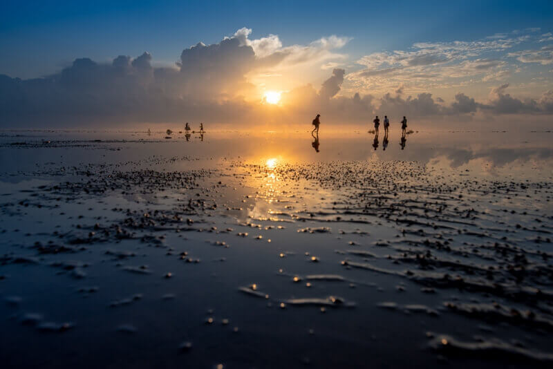 Sự kết hợp giữa bãi cát nâu sẫm,phẳng và rộng lớn với làn nước biển êm đềm tạo nên một khung cảnh tuyệt đẹp. Sự phản chiếu của bầu trời trên mặt nước,cùng với làn gió nhẹ tạo nên bầu không khí thoải mái và yên bình. Du khách cũng có thể quan sát những người đánh cá địa phương làm việc vào sáng sớm,góp phần tạo nên bầu không khí mộc mạc và thanh bình.