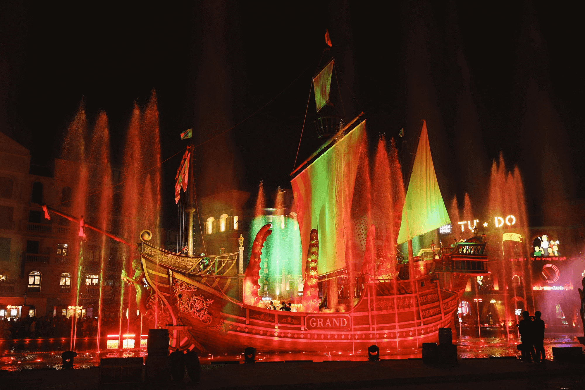 Đặc biệt,sân khấu chính của show diễn nằm tại dòng kênh Venice,nơi lòng sông rộng nhất. Hệ thống piton thủy lực và các thiết bị hiện đại khác được lắp đặt ngầm dưới nước mặn,đảm bảo sự an toàn và thuận tiện cho du khách khi tham gia các hoạt động trên thuyền. Những màn chiến đấu kịch tính giữa thủy thủ đoàn và các thế lực hắc ám,cùng hiệu ứng nước phun cao và visual Kraken,chắc chắn sẽ mang lại cho khán giả những khoảnh khắc thót tim và ấn tượng khó quên.