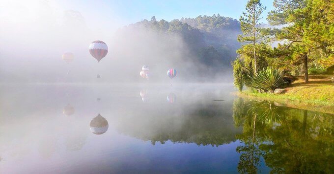 -Những chiếc khinh khí cầu đa màu sắc: Các quả khinh khí cầu lơ lửng trên không được cố định trên mặt hồ bằng những sợi dây chắc chắn,với hình dạng độc đáo và đa màu sắc,bạn sẽ được chiêm ngưỡng bức tranh sống động giữa bầu trời rộng lớn,cảm giác như bước vào một thế giới thần tiên.