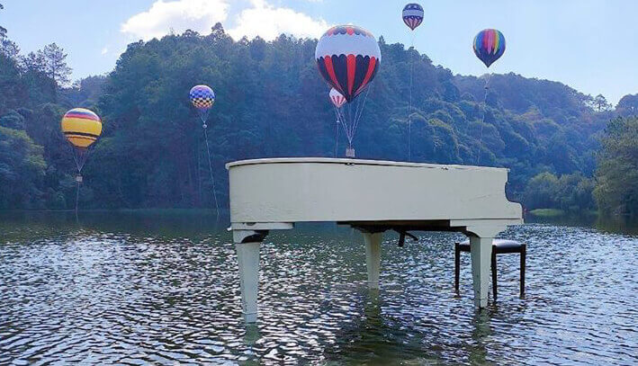 -Cây đàn piano trắng tinh khôi ngay trên mặt hồ: Tại Lạc Tiên Giới,trên mặt hồ xanh ngắt còn có cây đàn piano được đặt trên tạo nên một điểm nhấn nghệ thuật độc đáo và thu hút ánh nhìn. Khi thả dáng tại đây,sẽ tạo nên một bức ảnh bay bổng tựa như lạc vào chốn thần tiên.