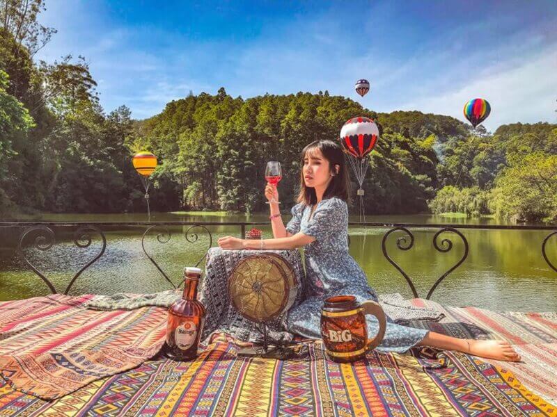 Ngoài checkin sống ảo,bạn cũng có thể được trải nghiệm bữa tiệc du mục độc đáo được trang trí với họa tiết thổ cẩm,xung quanh là cảnh rừng thông và hồ nước tươi mát,xa xa là những chiếc khinh khí cầu đa sắc màu. Tại đây cũng có thuê trang phục nên bạn có thể thoải mái lựa chọn trang phục phù hợp và thỏa sức chụp hình.